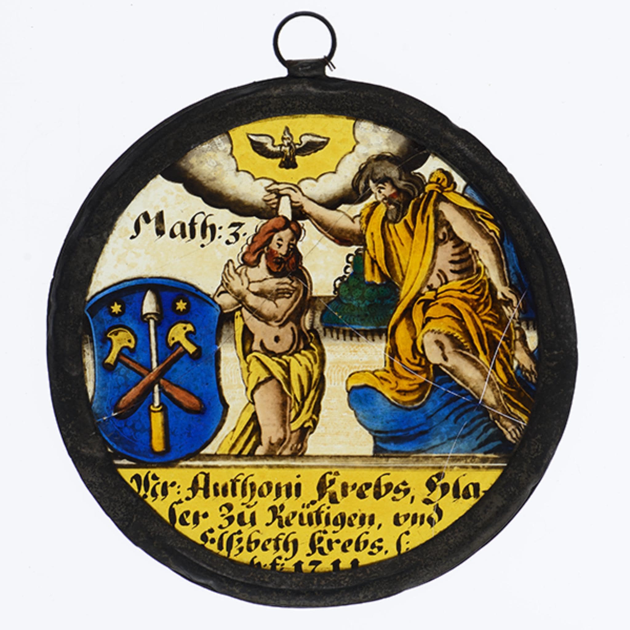 Dargestellt ist die Taufe Christi. Rechts erscheint Johannes der Täufer in gelbem Gewand kniend auf einem Felsen am Ufer. Neben ihm steht Christus mit gekreuzten Armen im Wasser. Über den beiden bärtigen Figuren schwebt die Taube des Heiligen Geistes in einem Wolkenkranz. Dieses Figurenbild entspricht in spiegelbildlicher Form dem Kupferstich aus Matthäus Merians Bilderbibel (Illustration zu Mt 3, 13–17). Während sich die Inschrift mit dem Namen des Stifters vor gelbem Grund in der Fusszone befindet, ist dessen Wappen mit den Glaserwerkzeugen zu Seiten Christi platziert.