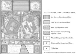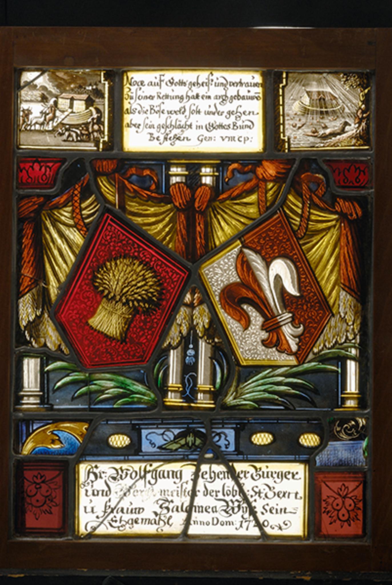Im Zentrum erscheinen über zwei Palmzweigen die gestürzten Ziegelschilde mit den Wappen von Wolfgang Zehender und Salome Wyss. Hinter ihnen sind vor dunkelblauem Grund zwei rote Teppiche mit gelbem Innenteil an zwei Aussen- und Innensäulen festgemacht. Im Oberbild aussen links sind die Tiere beim Besteigen der Arche Noahs festgehalten sowie in jenem aussen rechts die Arche in der Sintflut. Dazwischen ist die Tafel mit der Bildlegende angebracht. Die Stifternamen befinden sich in der Tafel am Scheibenfuss.