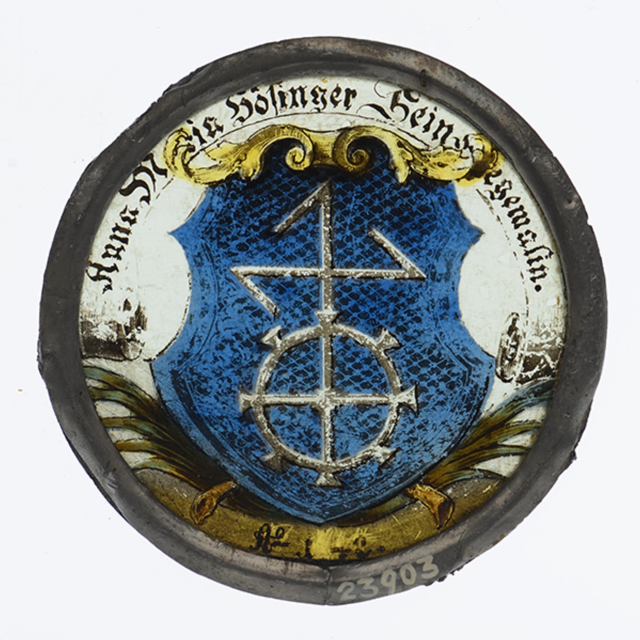 Aus der Inschrift lässt sich schliessen, dass zu dieser Scheibe ehemals ein Pendant mit dem Wappen des Ehemanns von Anna Maria Hösinger existierte (Rudolf Wegli liest den Namen als "Bosinger", derselbe lautet aber "Hösinger"). Die Herkunft dieser Anna Maria Hösinger liess sich bislang nicht klären. Das z. T. ausgekratzte Stiftungsjahr von deren Scheiben lässt sich in "1742" ergänzen.