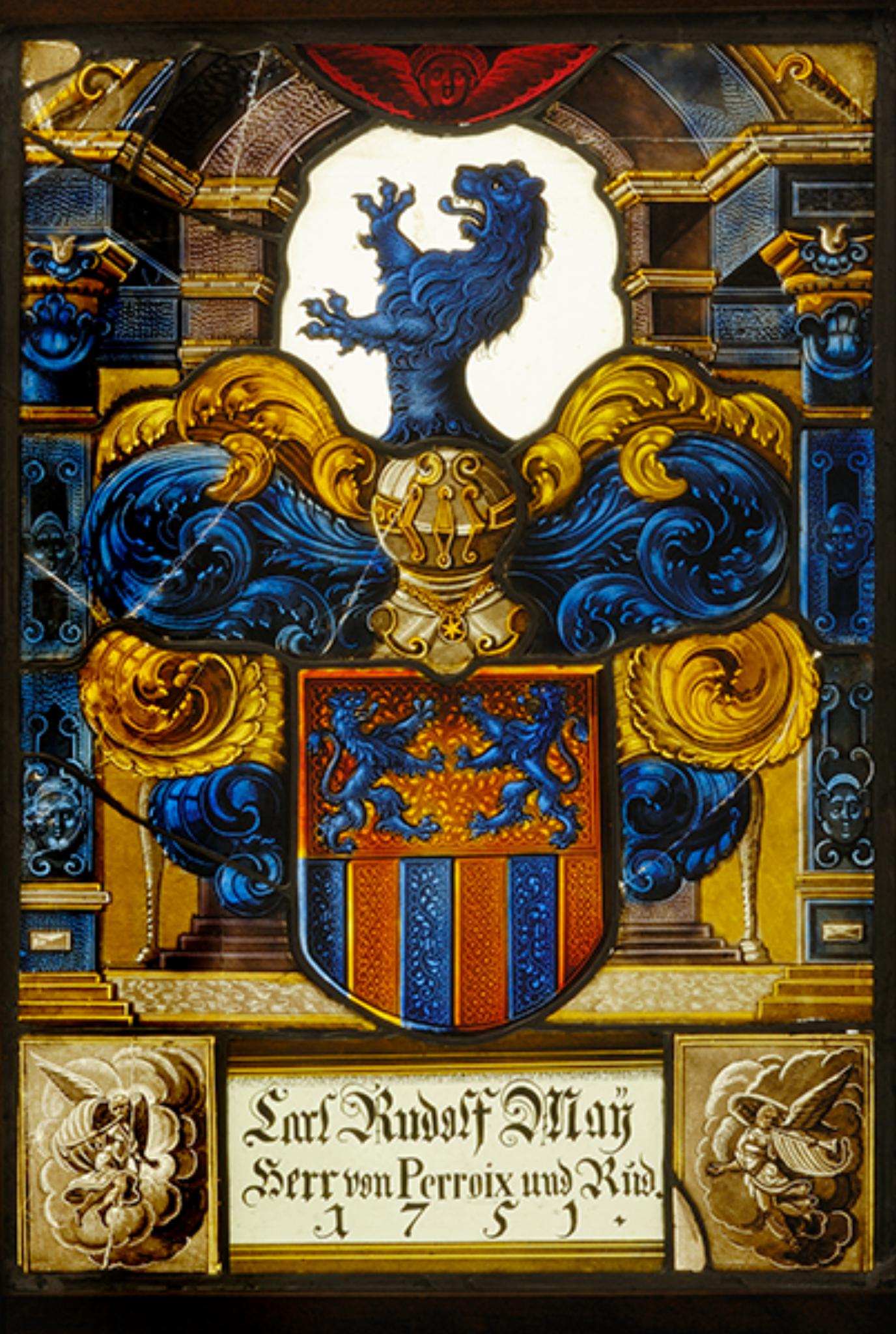 Der in der Inschrift genannte Stifter, Karl Rudolf May von Rued, liess 1751 in die vorliegende, um 1710 entstandene Scheibe sein Wappen, die Helmzier und die Inschriftentafel einsetzen. Darauf weisen neben den technischen Besonderheiten die engen Parallelen zu Andreas Fueters Scheiben von 1710 in Gurzelen. Verwandter noch ist die ebenfalls Fueter zugeschriebene Wappenscheibe Johann Rudolf Hackbretts von 1710 im Bernischen Historischen Museum (BHM Bern, Inv. 58504). Diese Scheibe, welche der Grossonkel Karl Rudolf Mays – Johann Rudolf Hackbrett war der Bruder seines Grossvaters mütterlicherseits – an einen unbekannten Ort stiftete, stammt sicher vom gleichen Ort wie die vorliegende zweitverwendete Scheibe. Es ist denkbar, dass sie seinen Eltern möglicherweise ins Schloss Rued gestiftet wurden.