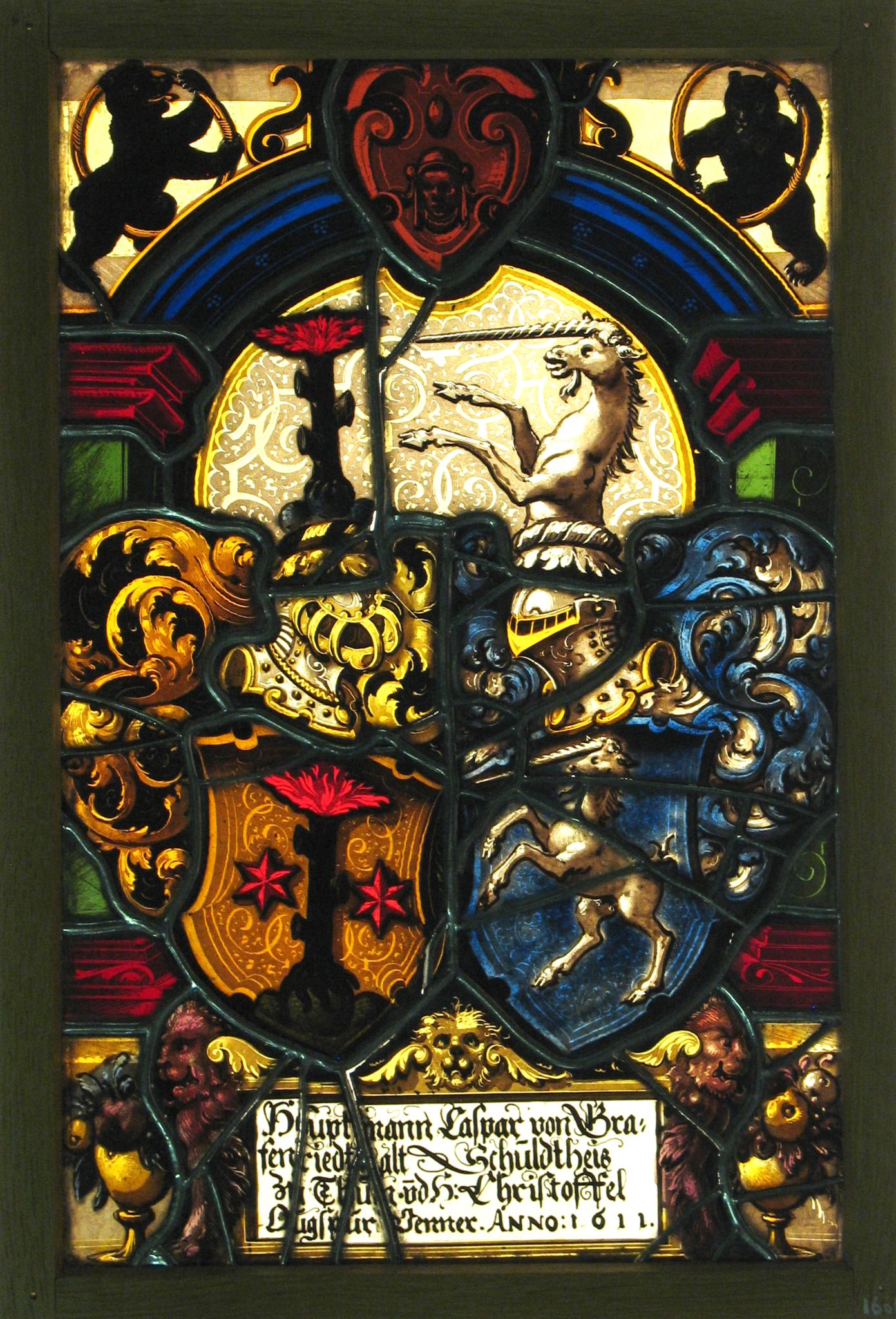 Das vorliegende, 1611 gemeinsam mit Christoph Augsburger gestiftete Glasgemälde im Schlossmuseum Thun stellt die einzige erhaltene Wappenscheibe des Hauptmanns und Thuner Schultheissen dar. Verschollen sind die Scheibe mit den Allianzwappen des Kaspar von Graffenried und der Barbara von Schönau von 1609 sowie eine undatierte Scheibe mit der gleichen Wappenallianz. Beide Werke sind als farbige Zeichnungen im Album des Emanuel Edmund von Graffenried (1829–81) im Bernischen Historischen Museum dokumentiert (BHM Bern, Inv. 6202.39 und 6202.40).