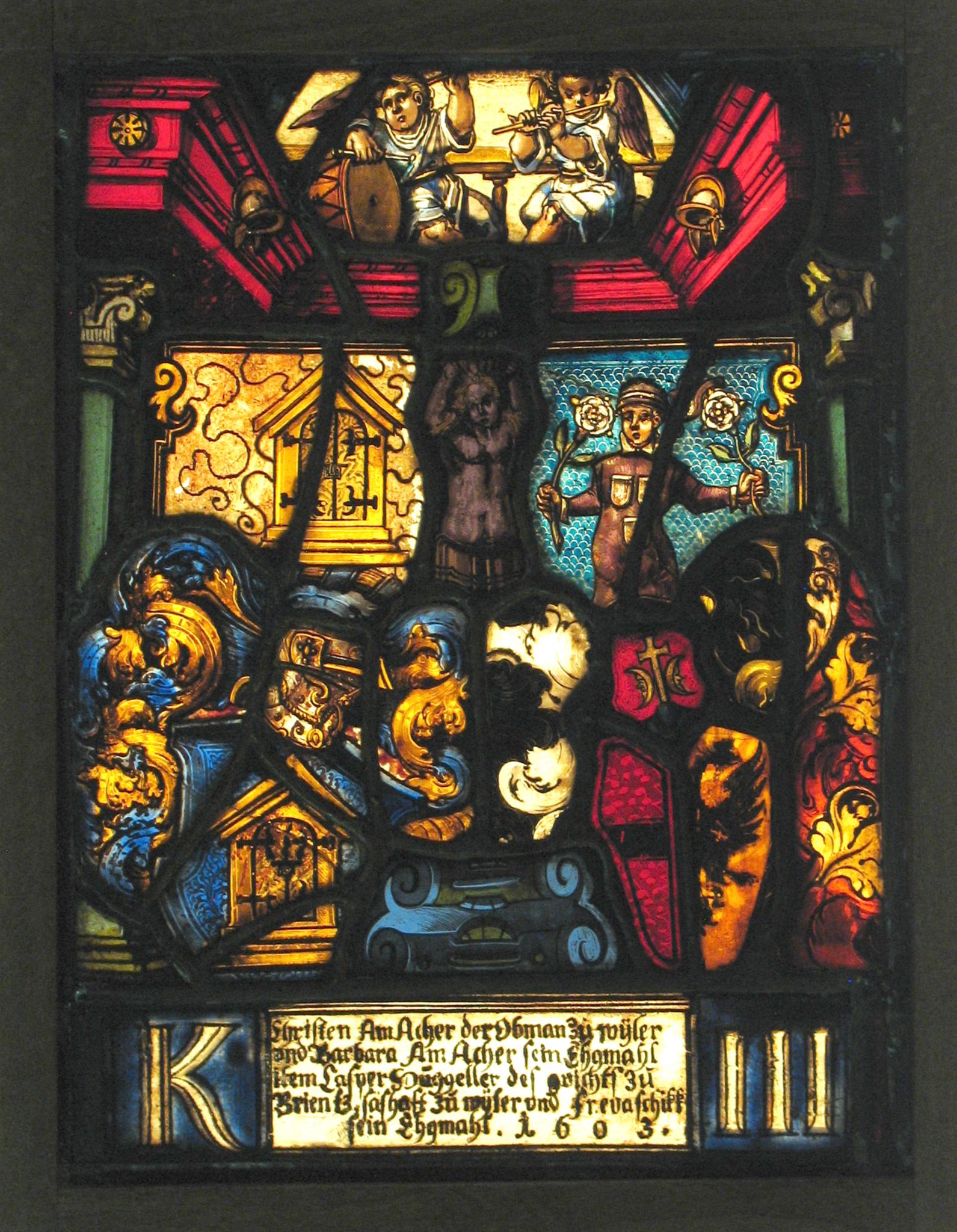 Die Scheibe ist das Werk eines Glasmalers, der keine grossen künstlerischen und technischen Fähigkeiten besass. Die Vermutung liegt deshalb nahe, dass dieser seine Werkstatt nicht in Bern, sondern an einem kleineren Ort irgendwo im Berner Oberland hatte. Zu denken ist dabei in erster Linie an Thun. Leider hat man keine klare Kenntnis darüber, wie es dort um 1600 um das Glasmalermetier stand. Aus den Quellen ist lediglich zu erfahren, dass 1590 einem Glasmaler namens Bartlome Norweger oder Horner erlaubt wurde, in der Stadt Thun für eine gewisse Zeit Wohnsitz zu nehmen, weil dort damals kein anderer Meister dieses Handwerks ansässig war (über ihn ist nichts Weiteres bekannt; vgl. Boesch 1955, S. 36). In der Folgezeit avancierte dann Kaspar Lohner (1587–1643) zum führenden Glasmaler Thuns. Da dieser 1603 erst sechzehnjährig war, fällt er als Schöpfer der Scheibe jedoch kaum in Betracht.
