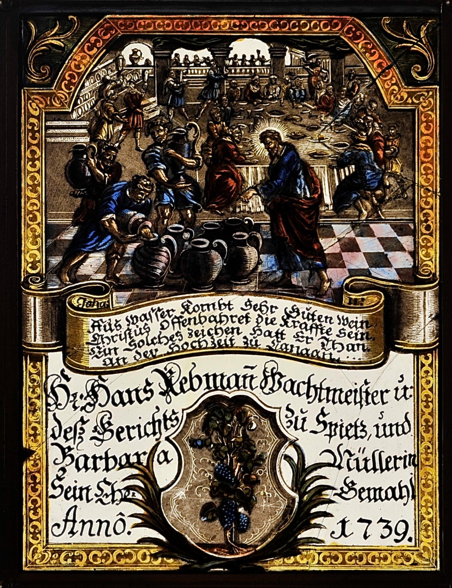 Hasler, R., & Keller, S. (2016). Bildscheibe Hans Rebmann und Barbara Müller mit Hochzeit zu Kana. Dans Vitrosearch. Consulté le 5 décembre 2025 de https://www.vitrosearch.ch/objects/2472655.