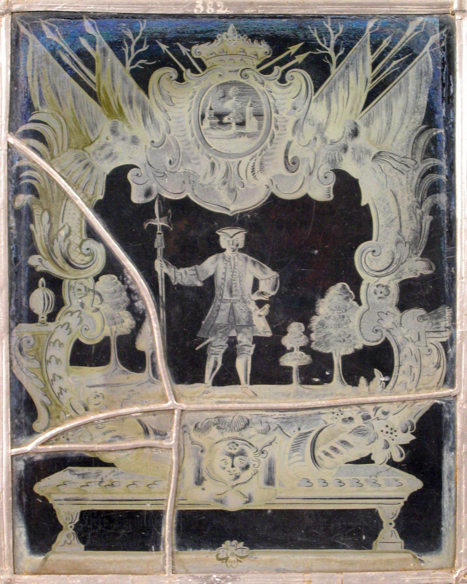Der uniformierte, zwischen Bäumchen stehende Stifter präsentiert sich mit der Halbarte in seiner Rechten in einem bühnenmässig arrangierten, auf einem breiten Schemel fussenden Gebilde aus Blatt- und Rollwerk. Dieses gipfelt in der bekrönten, den Wappenschild des Stifters enthaltenden Rocaillekartusche, die sich genau über diesem zwischen Fahnen und Waffentrophäen befindet.