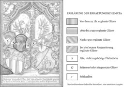 Der Helm des Wappens Manuel und ein Rahmenstück neu ergänzt (die Jahreszahl ist entgegen von Mandachs Angabe original); alte Flickstücke in den Helmdecken; ein Sprung und Sprungbleie; die Verbleiung erneuert.