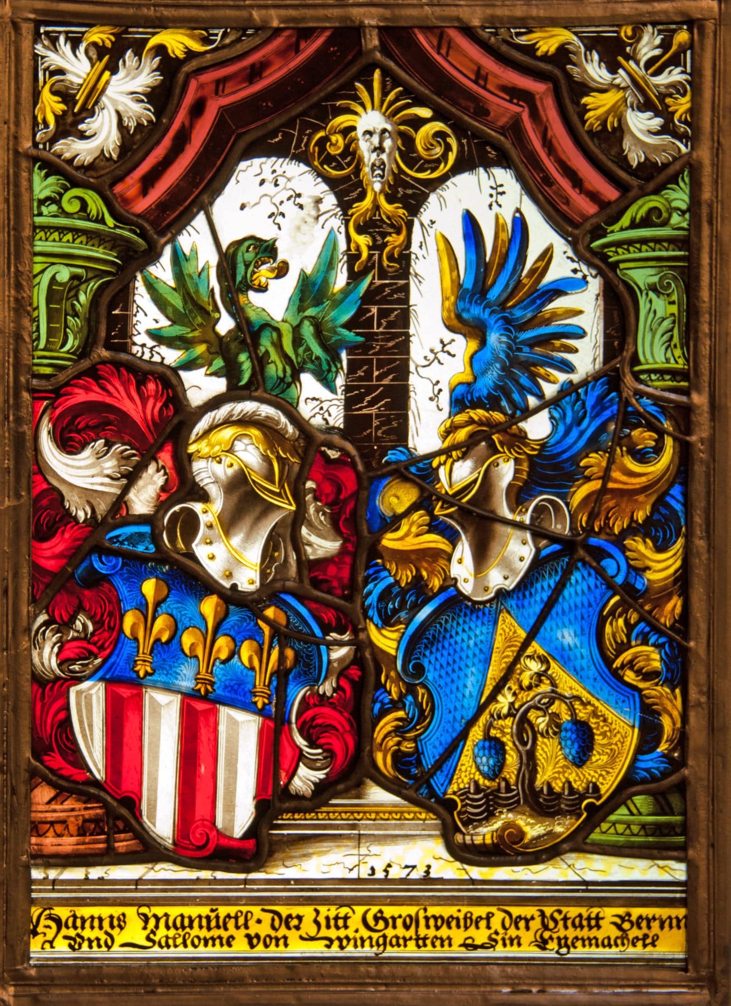BE_2318: Allianzwappenscheibe Hans (Johannes) Manuel und Salome von Weingarten (Wingarten)
