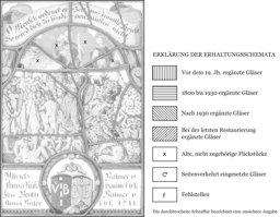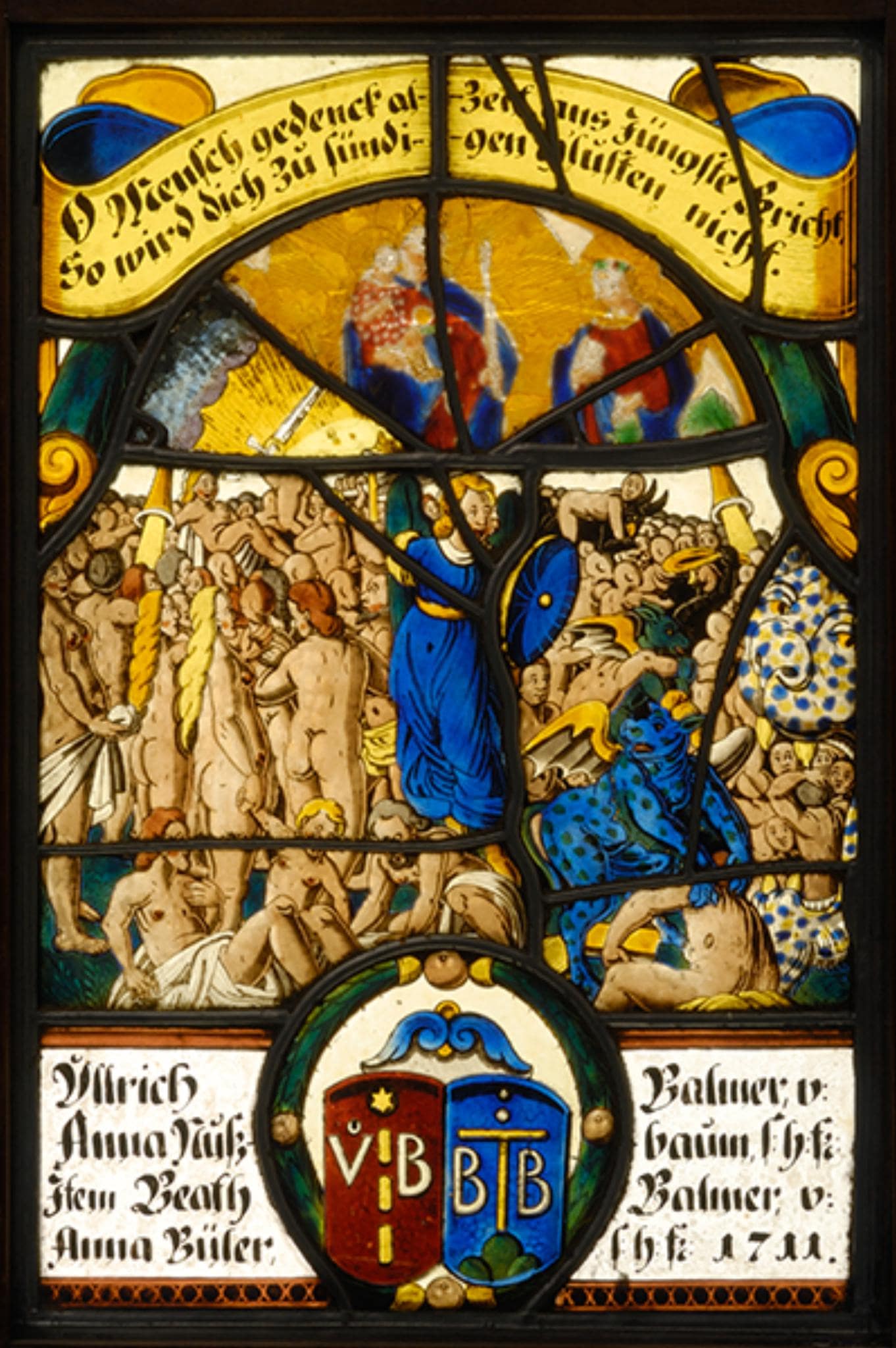 Im Hauptfeld der Scheibe ist das Jüngste Gericht mit der Auferstehung der Toten dargestellt. Im Zentrum steht mit erhobenem Schwert der Erzengel Michael in blauer Kleidung und treibt die Verdammten in den Höllenrachen, vor dem ein blauer Teufel einen Toten ergreift. Über dem Erzengel muss sich ursprünglich der im Himmel thronende, richtende Christus befunden haben. Die Darstellung krönt ein Bogen, vor dem ein gelbes Band mit der Bildlegende ausgerollt ist. Am Scheibenfuss steht die Stifterinschrift mit den zentral aufgesetzten, von einem runden Lorbeerkranz umfassten Wappen des Ulrich und Beat Balmer.