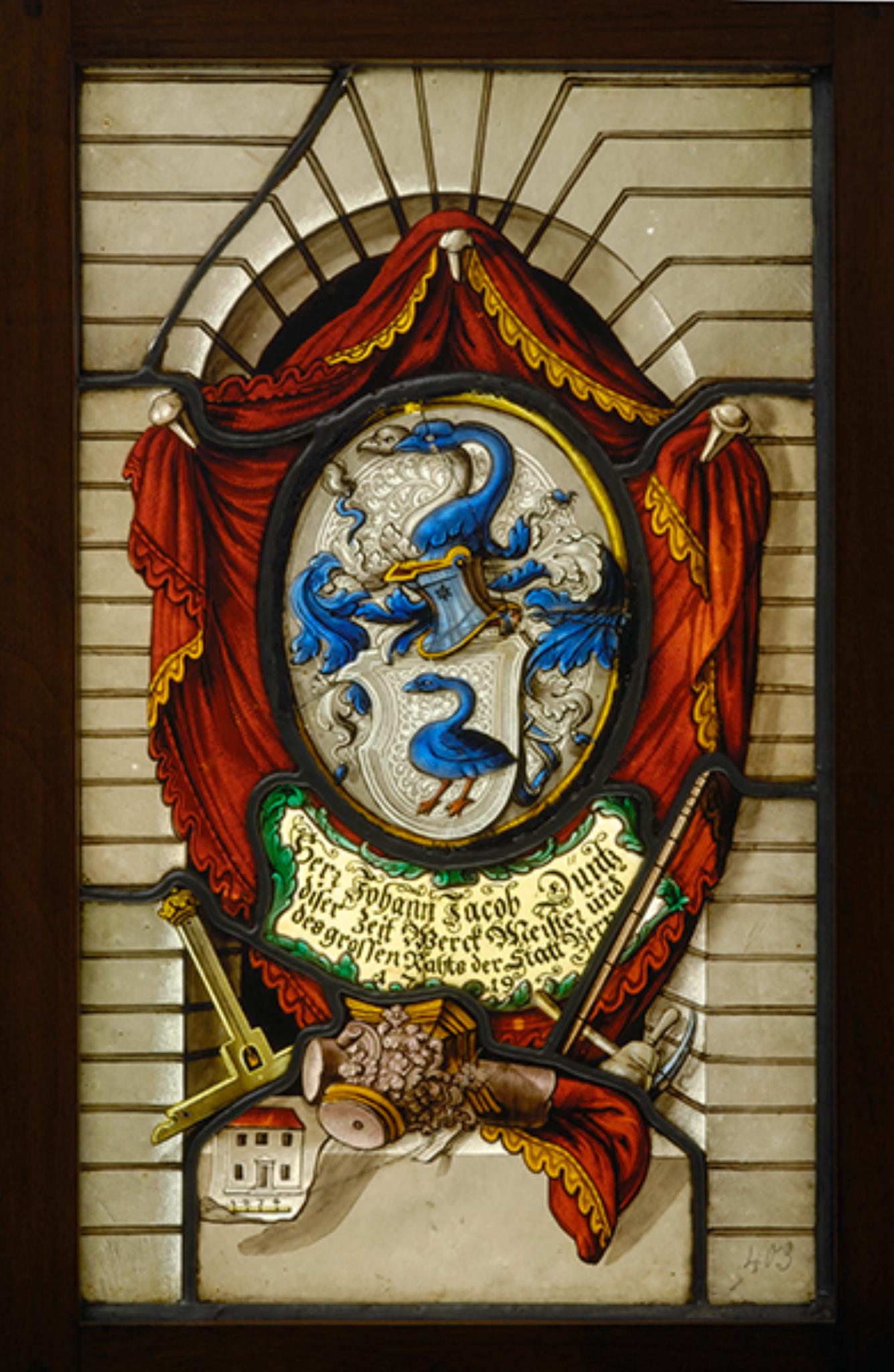 Im Zentrum der Scheibe prangt innerhalb eines ovalen Medaillons das Vollwappen des Werkmeisters Hans Jakob III. Dünz. Es wird von einer kunstvollen roten Draperie umfangen, die an eine genutete Rundbogennische in gelblich-grauem Steinton geheftet ist. Die Gegenstände auf dem Sims dieser Nische spielen auf den Beruf des Stifters an. Es sind Bleiwaage, Fassadenriss, korinthisches Kapitell, Säulenschaft, Schlageisen, Klüpfel, Spitz und Massstab. Die am Fuss des Wappens angebrachte Inschriftkartusche folgt dem Oval des Medaillons.