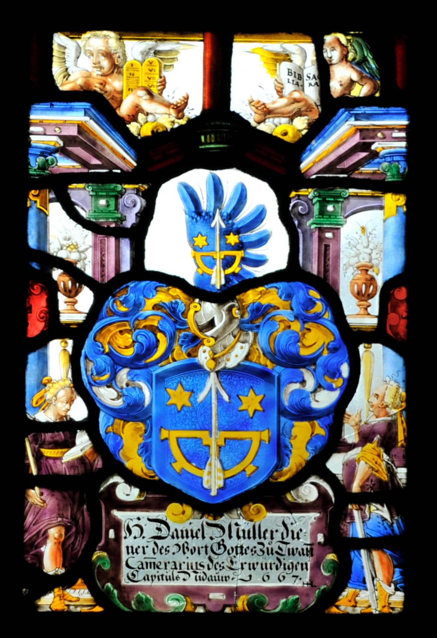 H. Daniel Müller die= / ner des Wort Gottes Zů Twan / Camerarius des Erwürdigen / Capituls Nidauw. 1667. / HHL.