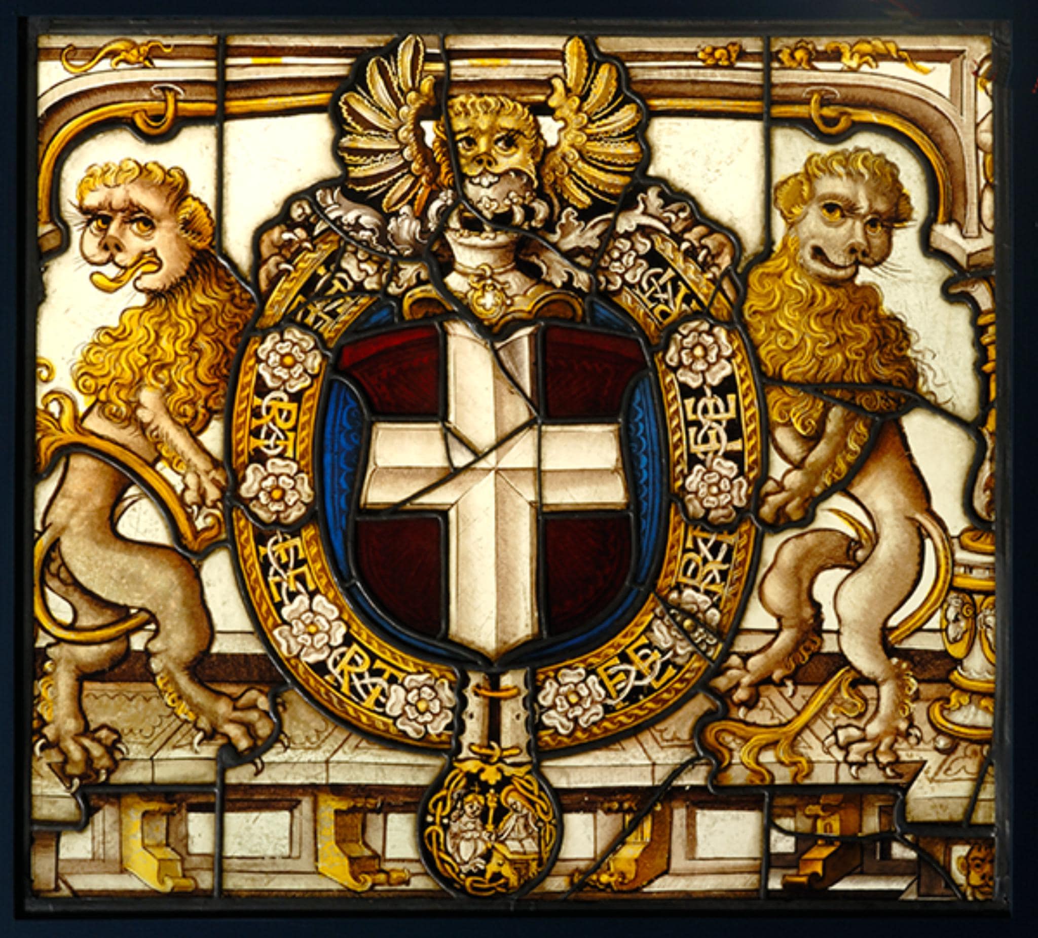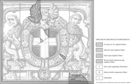 Das Vollwappen des Herzogs Karl III. von Savoyen wird von der Kette des Annunziatenordens umfangen und von zwei vor farblosem Grund auf dem gefliesten Podium stehenden Löwen gehalten. Die Architekturrahmung bildet ein Flachbogen auf Balustersäulen (diejenige auf der linken Seite ist weggeschnitten).