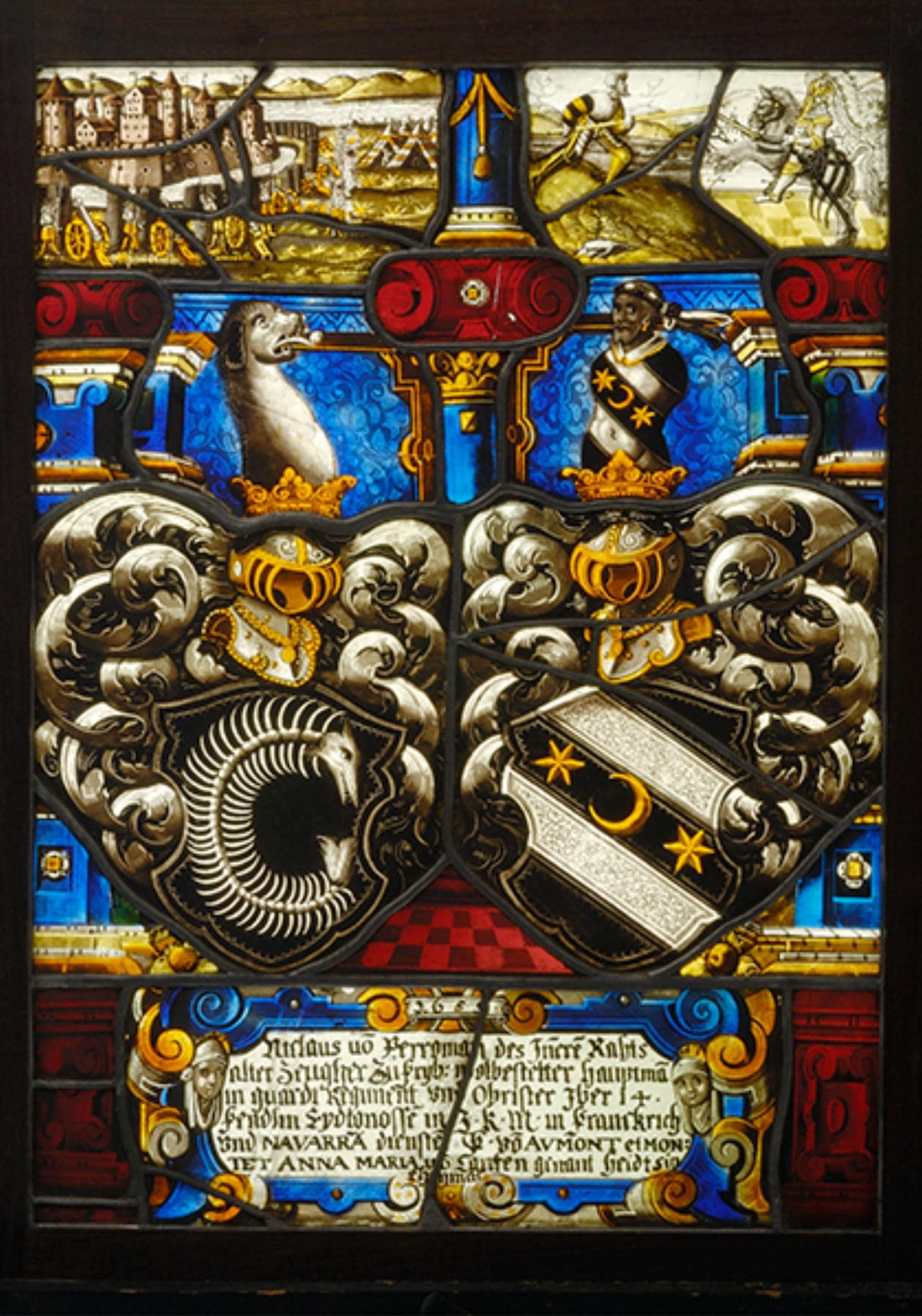 Hasler, R., Keller, S., & Bergmann, U. (2016). Allianzwappenscheibe Niklaus von Praroman und Anna Maria von Lanthen-Heid. Dans Vitrosearch. Consulté le 5 décembre 2025 de https://www.vitrosearch.ch/objects/2473471.