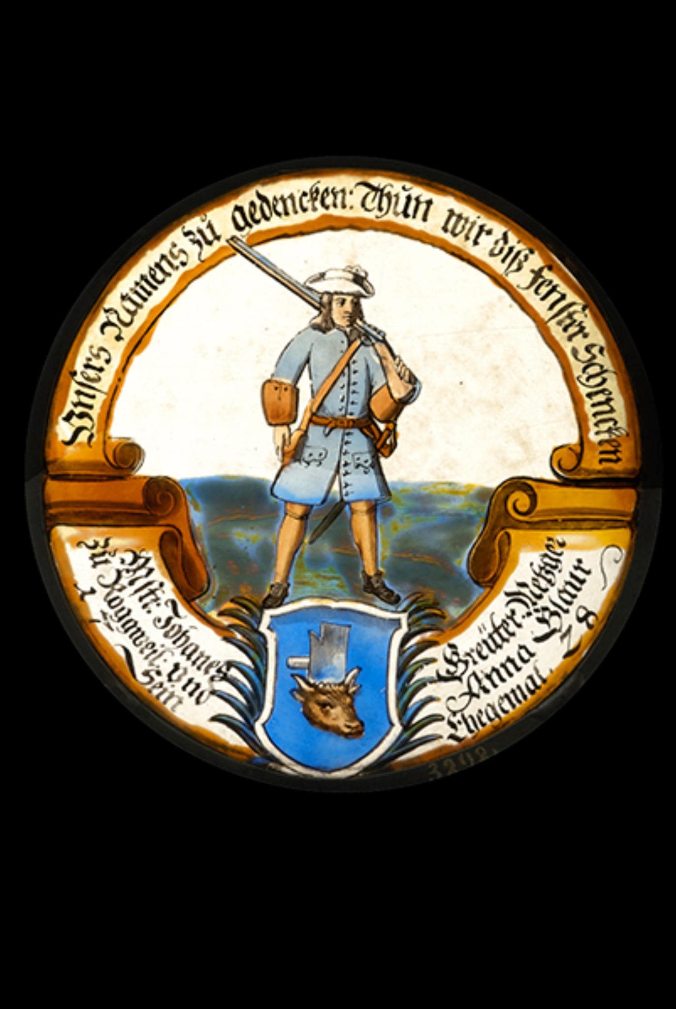 In der monolithen Rundscheibe ist der Stifter als Soldat in Achtungsstellung vor farblosem Grund in einem grünen Wiesenfeld festgehalten. Zu seiner Bewaffnung gehören sein geschultertes Gewehr sowie das am Gürtel festgemachte Schwert. Das Figurenbild umfassen zwei Schriftbänder. Davon ist dem unteren das umkränzte Wappen des Stifters zentral aufgesetzt.
