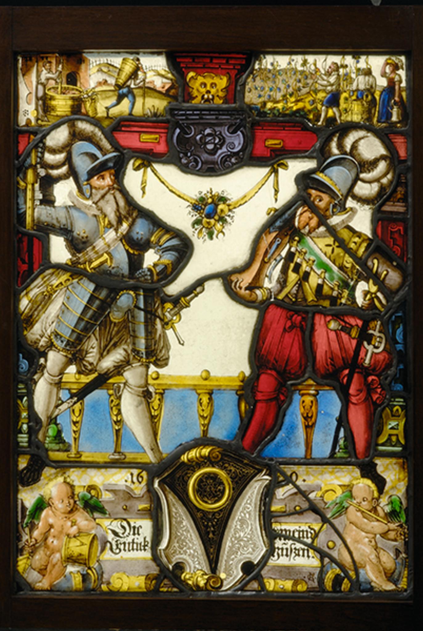 Das zentrale Motiv bilden die beiden vor einer Balustrade und farblosem Grund dargestellten Schildbegleiter, ein Halbartier und ein Büchsenschütze. Der Erstgenannte erscheint in weissen Beinkleidern und einem stahlblauen Halbharnisch. Zu seiner Bewaffnung gehören die von ihm in der Rechten gehaltene Halbarte sowie Schwert und Schweizerdolch. Sein ebenfalls ein Schwert am Gürtel mit sich führender Kollege trägt rote Pluderhosen und Strümpfe, ein braunes Hemd, ein gelbes Wams und ebenso wie der Halbartier einen mit Straussenfedern geschmückten stahlblauen Helm. Während er seine Büchse geschultert hat, hält er in der Linken die Gewehrgabel. Um seine Brust hat er ein grünes Patronenbandelier gebunden. Hinter den beiden Schildwächtern erhebt sich eine einfache Rahmenarchitektur aus roten Pfeilern und einem roten Gebälk. Als Trommler und Pfeifer sind ihnen in den unteren Bildecken zwei Putten beigesellt. Dieselben sitzen auf ihren Spangenhelmen zu Seiten der grauen und gelben, den Stifternamen enthaltenden Rollwerkkartusche und dem ihr zentral aufgesetzten Schild mit dem Stifterwappen. Es ist das Wappen der Schaffhauser Familie von Waldkirch, bei dem es sich jedoch um eine Ergänzung handelt. Das Oberbild schildert den "Wimmet" (Boesch), d. h. die Traubenlese im Rebberg sowie das Keltern des Weines, das heisst die für Gütighausen im Zürcher Weinland kennzeichnenden Erwerbszweige.
