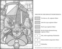 Die beiden farblosen Gläser in den Zürcher Wappen sowie einige kleine Glasstücke neu ergänzt; einige kleine alte Flickstücke; Sprünge und Sprungbleie; die Verbleiung erneuert.