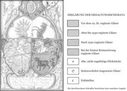 Zwei alte Flickstücke in der Ecke oben rechts; Sprünge und Sprungbleie; die Verbleiung erneuert.