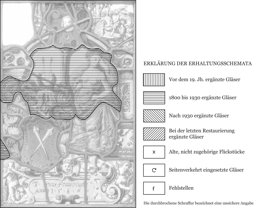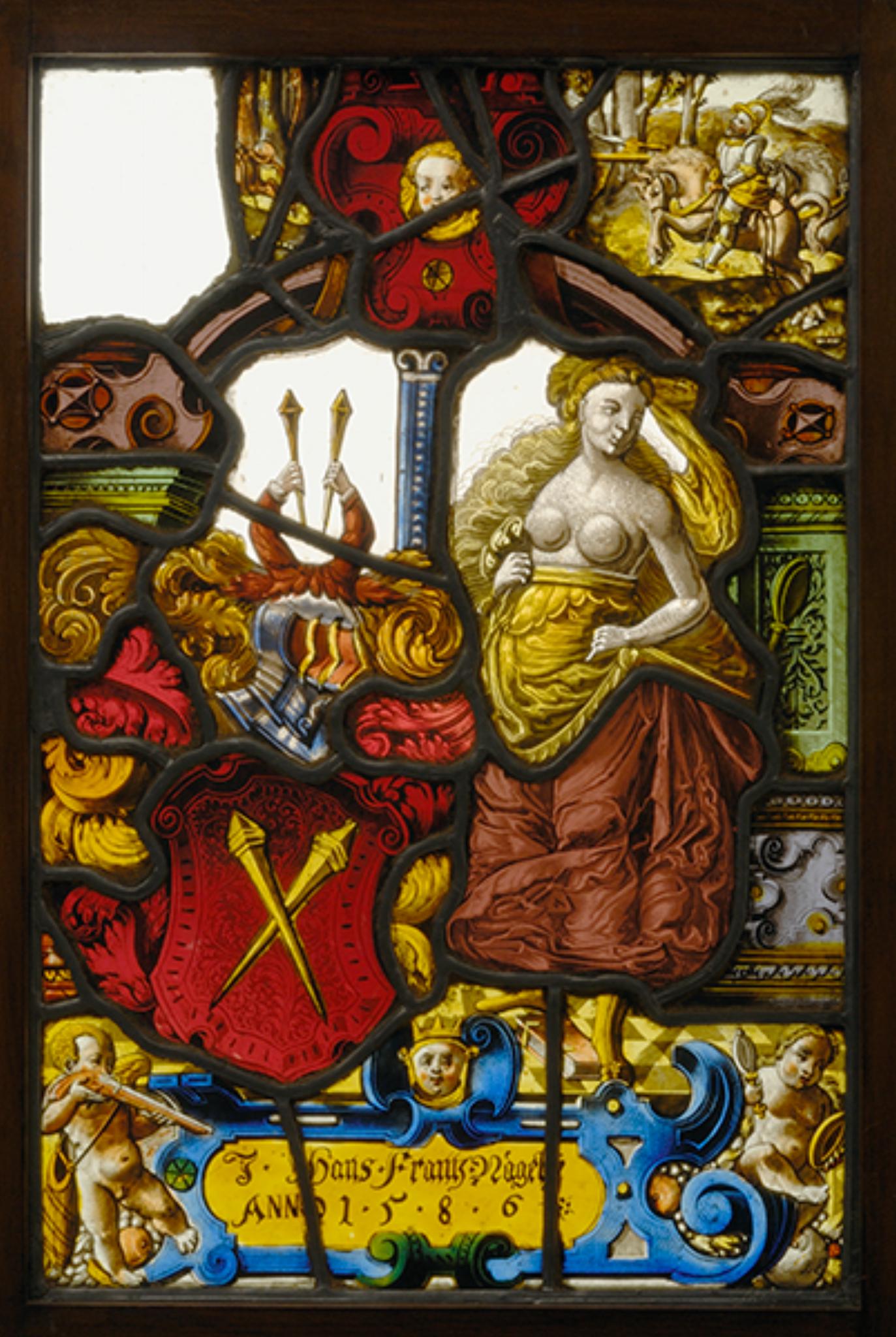 Neben dem Vollwappen von Hans Franz Nägeli erscheint eine auf gelb und braun gefliestem Boden stehende, mit ihren Füssen auf ein geschlossenes Buch tretende allegorische Frauengestalt. Ihre Brüste entblössend, zieht sie ihr um den Bauch gebundenes gelbes Oberkleid über ihren kunstvoll gefalteten weinroten Rock. Der hinter ihr an den grünen Pfeiler gelehnte Spiegel lässt vermuten, dass sie die Klugheit verkörpert. Hinter Figur und Wappen erhebt sich eine prachtvoll gestaltete Pfeilerrahmung mit einem lila Rollwerkbogen, dessen Scheitel eine rote Kartusche mit Puttenkopf schmückt. Von den beiden oberen Zwickelbildern ist nur dasjenige rechts erhalten. Es zeigt einen in einer Waldlandschaft vorwärtsstürmenden geharnischten Reiter. Am Scheibenfuss ist der Stiftername in einer blauen Rollwerkkartusche enthalten. Zu Seiten dieser Kartusche befindet sich je ein Putto mit einem Gewehr bzw. Spiegeln in der Hand.