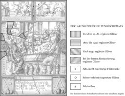 Die Oberbildszene mit dem Bethlehemitischen Kindermord und mit der sich auf die Anbetung des Jesuskindes durch die Heiligen Drei Könige beziehenden Bildlegende stammt offenbar aus einer Scheibe, in deren Zentrum diese Anbetungsszene festgehalten war. Im Bayerischen Nationalmuseum in München befindet sich interessanterweise eine Scheibe, die im rechten Oberbild die identisch gestaltete Szene des Bethlehemitischen Kindermords und im Hauptbild die Anbetung der Heiligen Drei Könige zeigt (Inv. Nr. G 801; Hans Brunner, Interlaken, undatiert, 29,50 x 20,50 cm; vgl. Schinnerer 1908, Kat. Nr. 258). Auch die Inschrift auf den beiden Oberbildern entspricht derjenigen der als Flickstücke eingesetzten Oberbildern der vorliegenden Scheibe. Da die Scheibe in München mehrere Flickstücke aufweist und auch ihre beiden Oberbilder einen unterschiedlichen Schriftduktus aufweisen, ist schwierig zu beurteilen, wie sie im Originalzustand aussah. In stilistischer Hinsicht unterscheiden sich die beiden Scheiben. Sie stammen sicher nicht aus derselben Werkstatt, möglicherweise lag ihnen aber eine gemeinsame Vorlage vor.