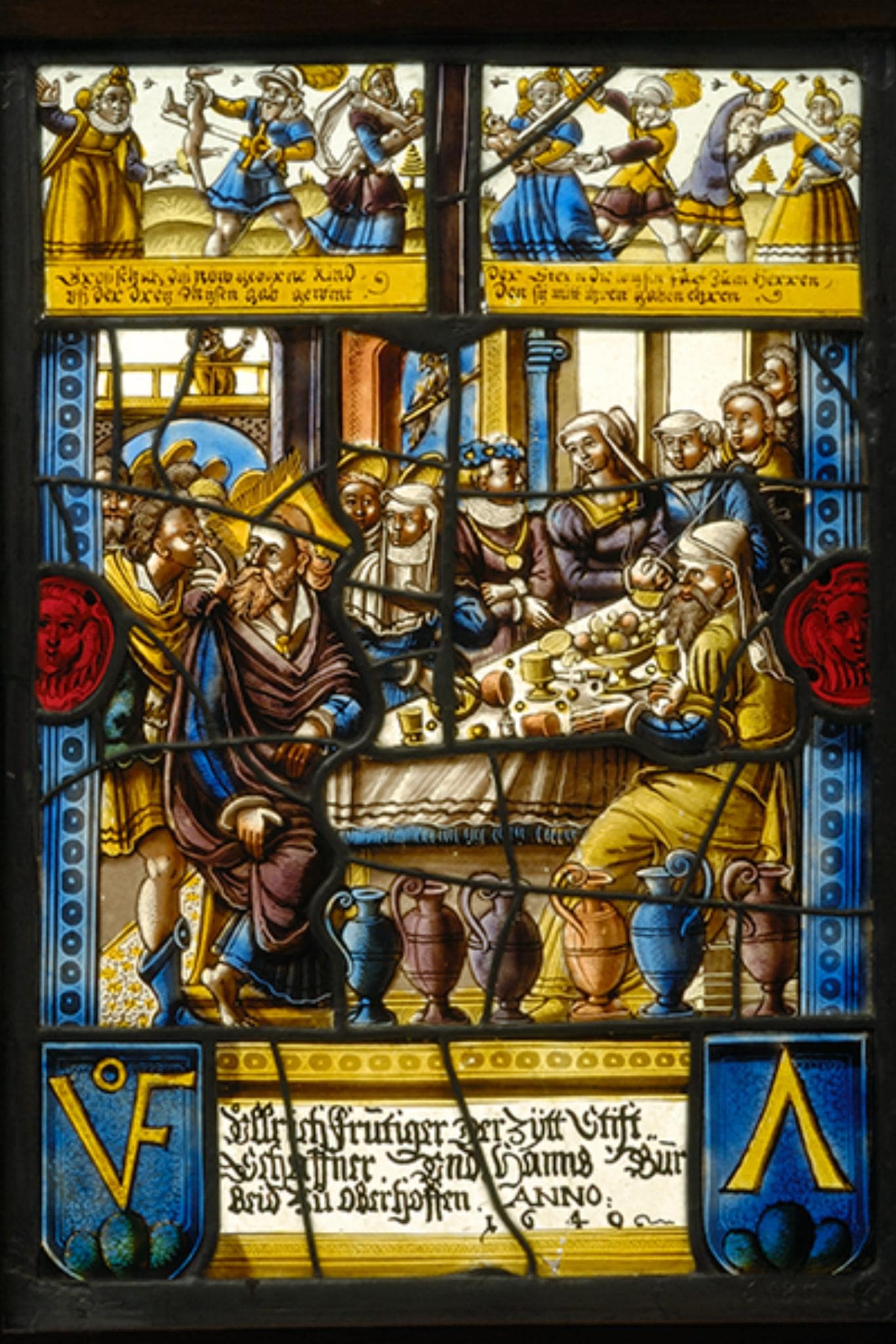 Für die Darstellung der Hochzeit zu Kana verwendete Lohner die gleiche Vorlage wie der Berner Glasmaler, der 1651 die dem gleichen Thema gewidmete Bildscheibe für Hans und Jost Joder sowie ihren beiden Frauen anfertigte (Kat. Stuker 2017, Nr. 1104).