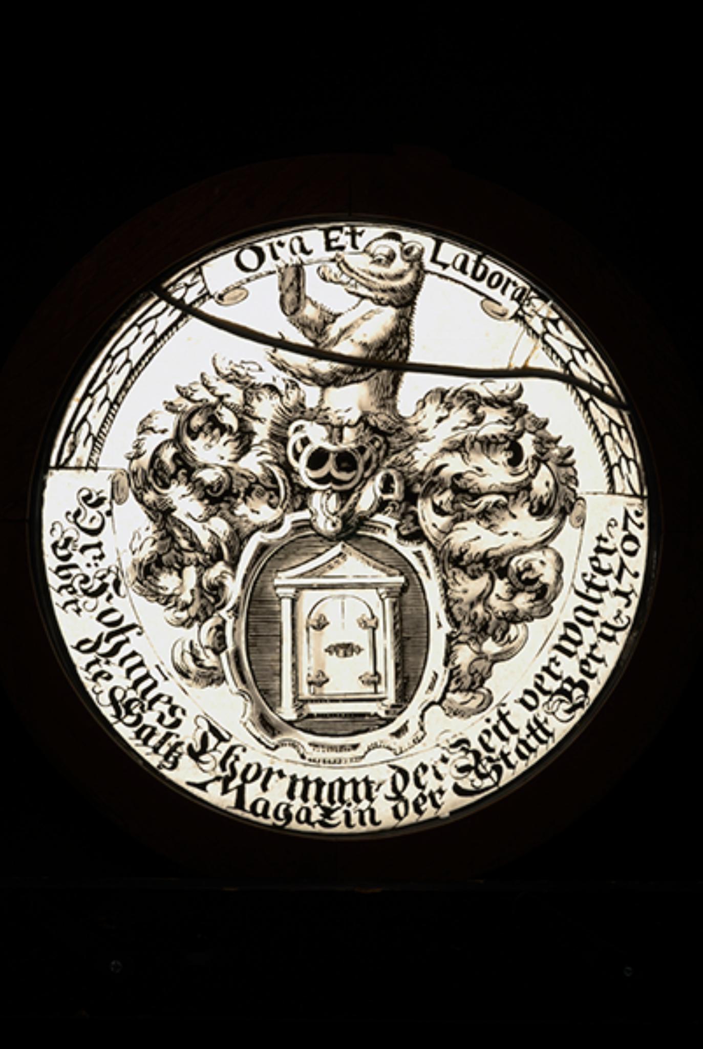 Die Scheibe weist enge Parallelen zur Wappenscheibe Abraham Lienhards von 1707 auf, die sich in Privatbesitz befindet (BE_2371). Es ist aufgrund des gleichen Datums, des gleichen Aufbaus und der gleichen Grösse anzunehmen, dass diese beiden Rundscheiben an den gleichen unbekannten Bestimmungsort gestiftet wurden. Ihre beiden Stifter waren im Salzwesen tätig und übernahmen im Abstand von 14 Jahren die Landvogtei Aarberg.