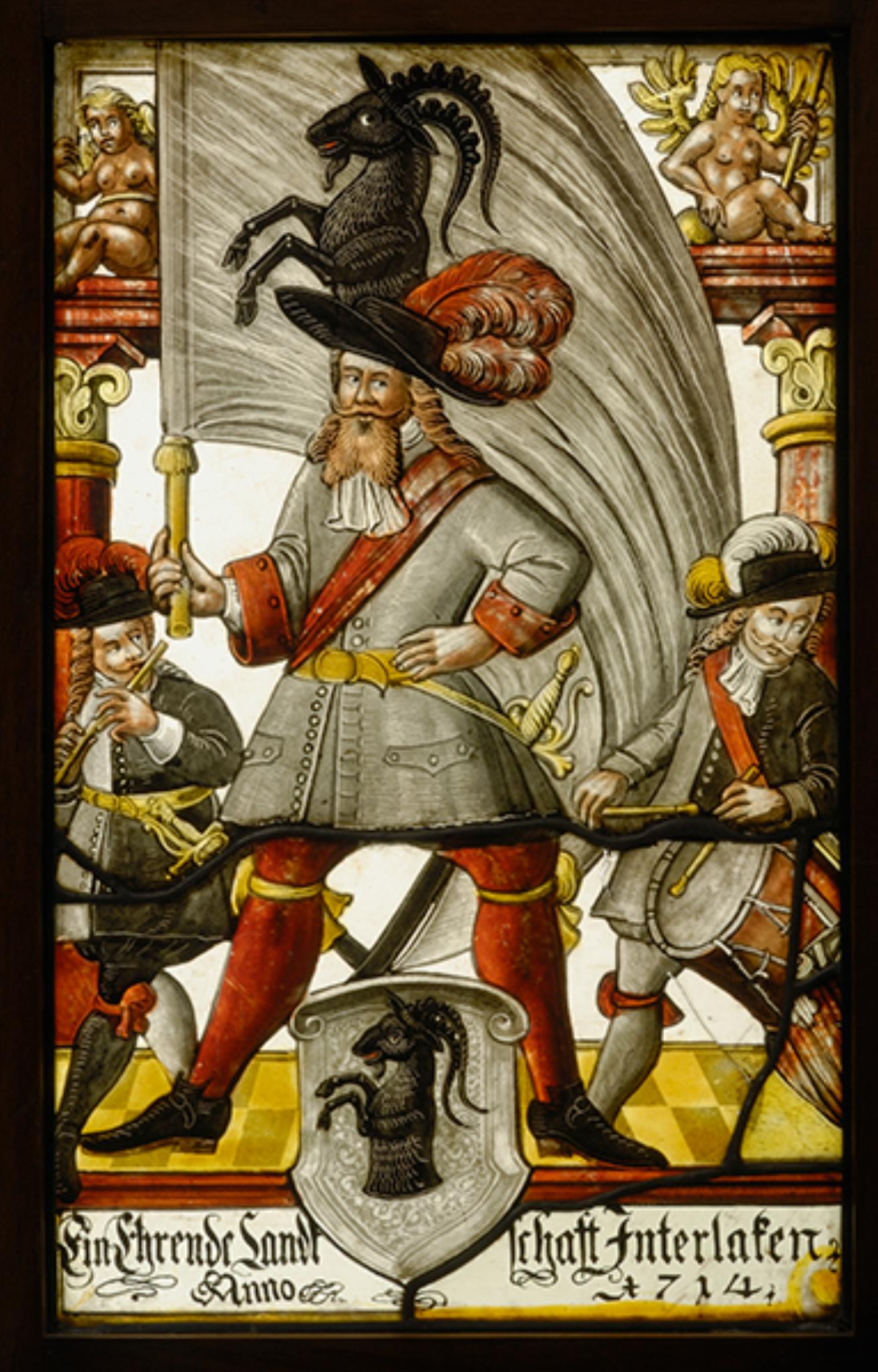 Im Zentrum steht auf gelb gefliestem Boden der bärtige Bannerträger der Landschaft Interlaken. Er trägt die Uniform der damaligen Landmiliz, d. h. ein hellgraues Wams mit roter Schärpe, roten Strümpfen und schwarzem Federhut. Sein Schwert am Gürtel festgebunden, hält er in der Rechten das Banner der Landschaft Interlaken. Er wird von einem Trommler und Pfeifer begleitet, deren Kleidung in den Mi-parti-Farben Schwarz und Grau gehalten ist. Das Landschaftswappen Interlakens zu seinen Füssen ist ins Zentrum der über den Sockel laufenden Inschrift gesetzt. Auf dem von roten Säulen getragenen roten Gebälk sitzen zwei nackte Putten.