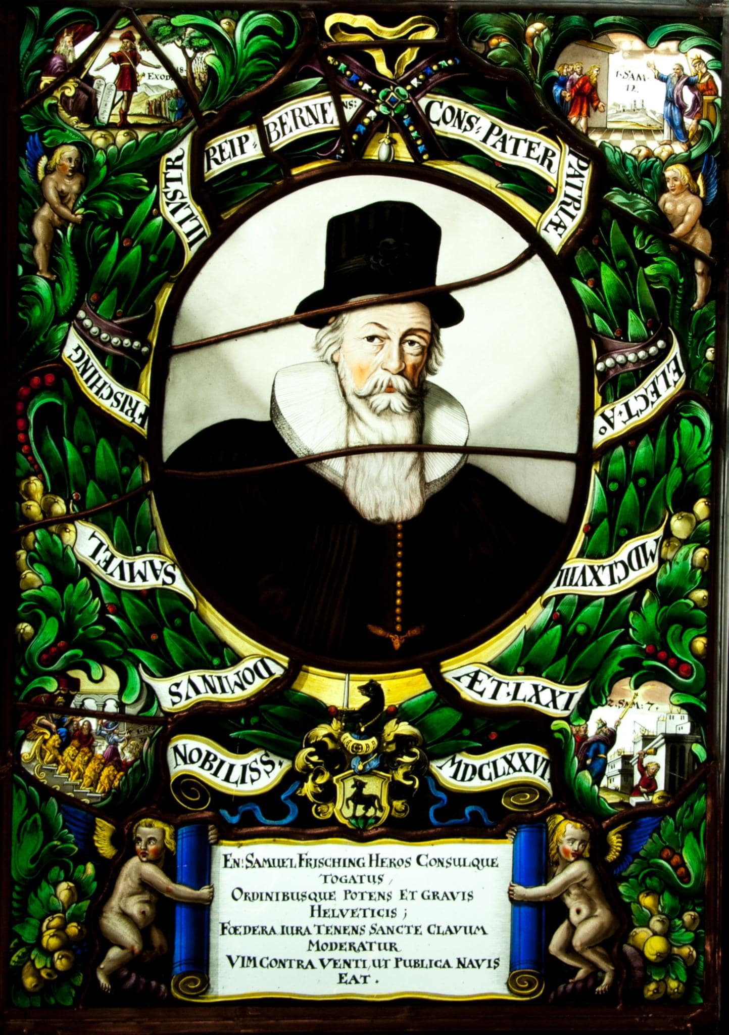Samuel Frisching (12.3.1605–1.9.1683) war der Sohn Johanns (1569–1620) und der Maria Sager. 1627 ehelichte er Susanna Lombach und 1661 Katharina von Bonstetten. 1621–1623 studierte er in Genf und danach bis 1626 in Paris. Zurück in Bern wurde er hier 1629 des Grossen Rats, 1634 Grossweibel, 1637 Vogt von Trachselwald, 1646 Sechzehner, 1647 Kleinrat, 1648 Bauherr und 1653 Venner. Seine Karriere gipfelte im Schultheissenamt, das er von 1668 bis zu seinem Tod bekleidete. Als Landvogt zu Trachselwald erweiterte er das dortige Schloss, seinen Amtssitz. Mit Langnau eng verbunden, liess er sich dort einen Landsitz bauen. In Langnau erwarb er sich 1649 auch das Pintenschenkrecht im Gasthaus "Hirschen". 1673/74 wirkte er dort als Initiant des Kirchenbaues (HLS 4/2005, S. 838; HBLS 3/1926, S. 341). In Bern war Frisching von 1620–1683 Besitzer des Von-Wattenwyl-Hauses an der Junkerngasse, für das er 1676 vermutlich seine noch heute dort befindliche Porträtscheibe in Auftrag gab.