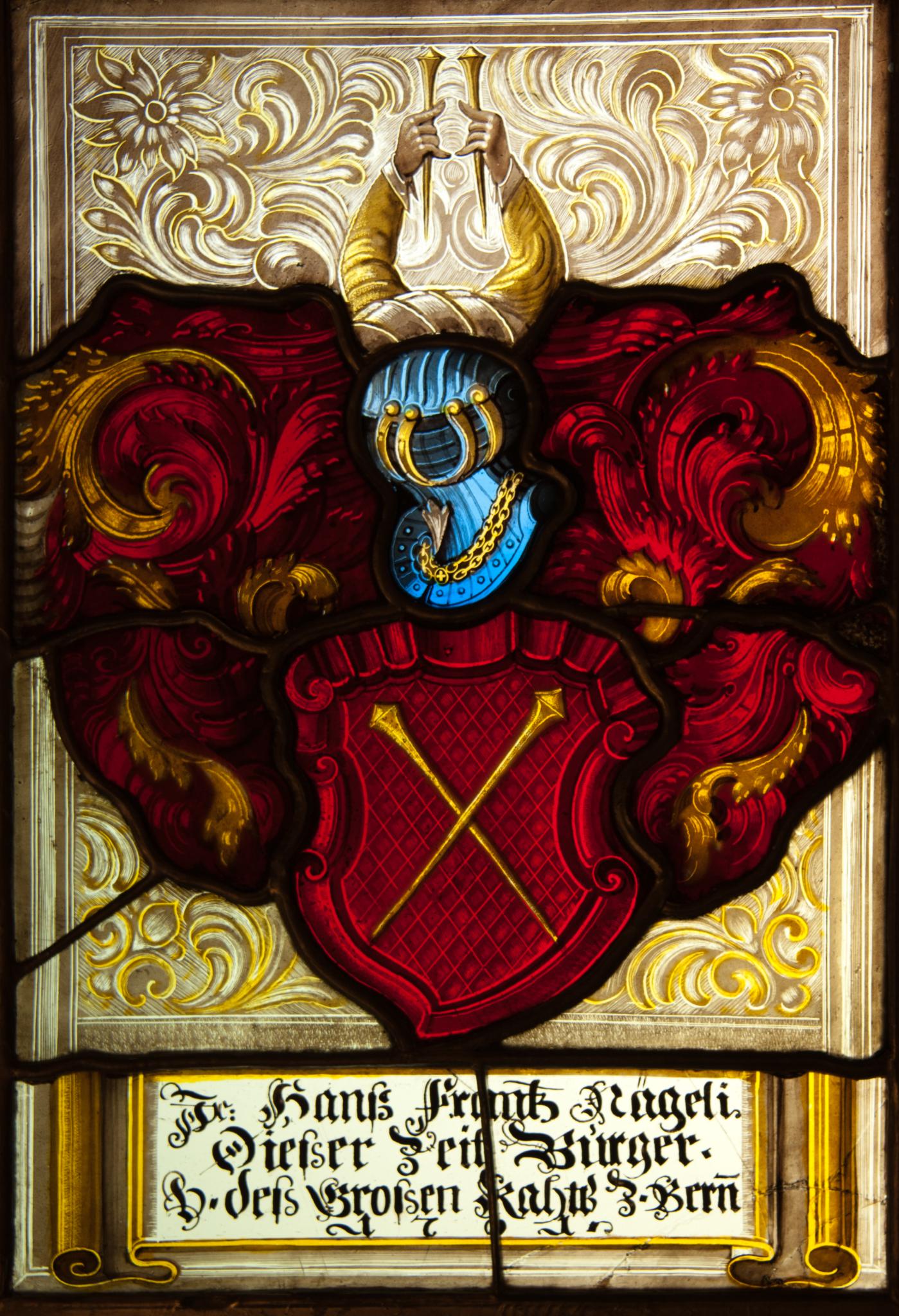 Den einzigen Originalteil des Glasgemäldes bildet das 1701 datierte Glas mit der Schriftrolle. Dieses Glas besitzt zahlreiche geklebte Sprünge, ein Sprungblei sowie Retuschen in der Inschrift (s. u.). Alle übrigen Gläser sind neuzeitliche Ergänzungen, die anlässlich zweier Restaurierungen eingefügt wurden. Die Fotografie des Bernischen Historischen Museums zeigt die Scheibe nur mit dem linken Teil der Inschrift. Der rechte Teil muss zur Zeit der Fotoherstellung in stark zersprungenem Zustand separat aufbewahrt und später wieder eingesetzt worden sein. Die auf dem Foto angegebene Jahreszahl "1701" belegt, dass dem Fotografen die ganze Inschrift bekannt war.