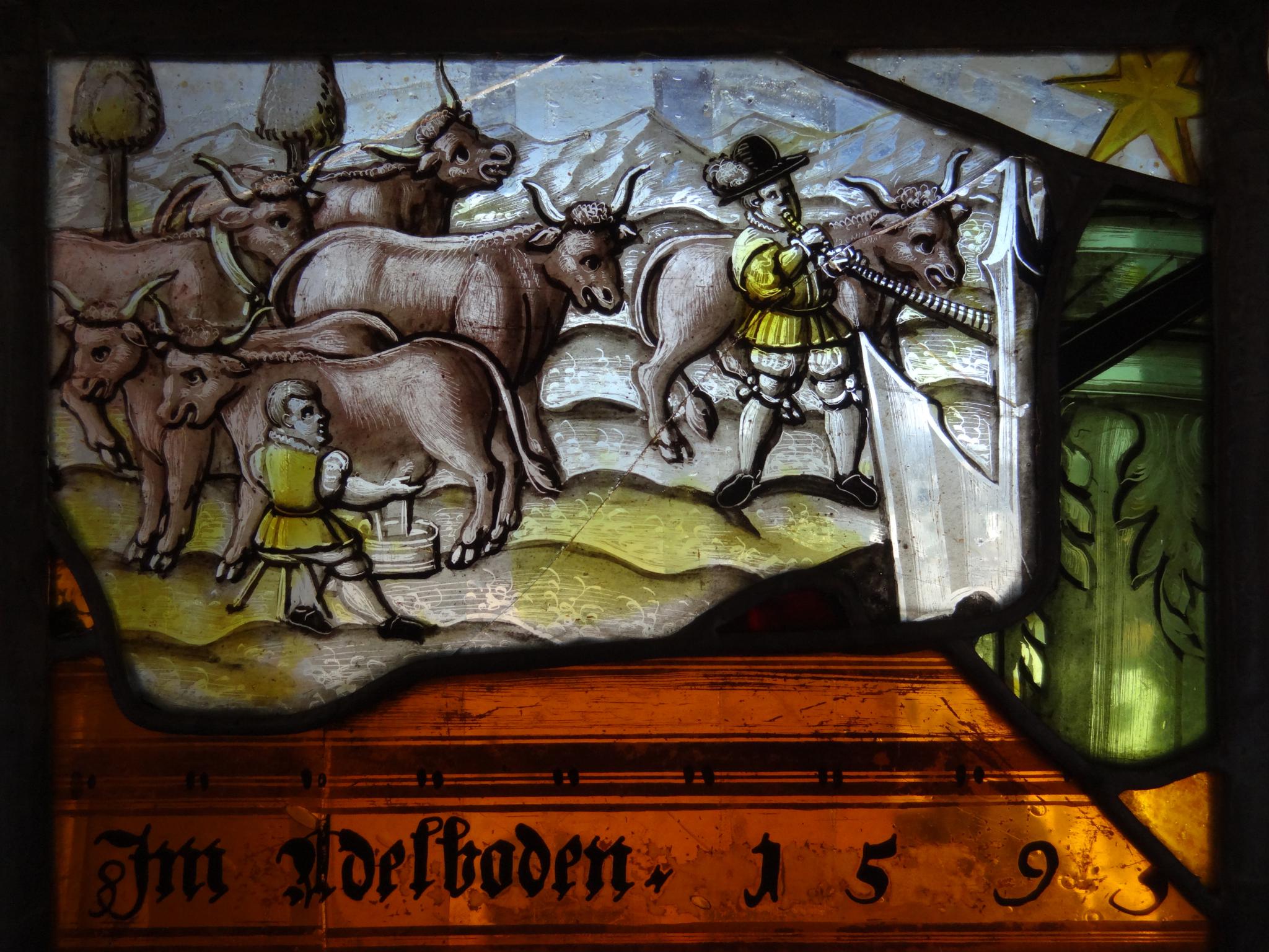 Das aus einigen wenigen Fragmenten zusammengefügte Scheibchen zeigt einen Bauern beim Melken seiner Kuhherde und einen Alphornbläser in einer hügeligen Landschaft sowie darunter ein Inschriftenstück.