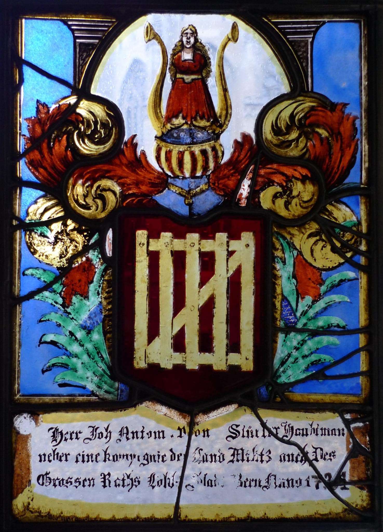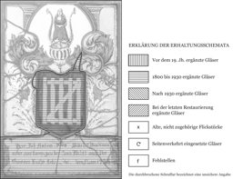 Das Vollwappen Johann Anton von Stürlers steht vor blauem Grund. Dahinter erhebt sich ein die Helmzier umfassender, schlicht gestalteter schwarzer Bogen. Das Glas am Scheibenfuss mit der Stifterinschrift auf dem Vorhang ist erneuert. Die ganze Komposition umfasst eine schwarze Rahmenleiste.