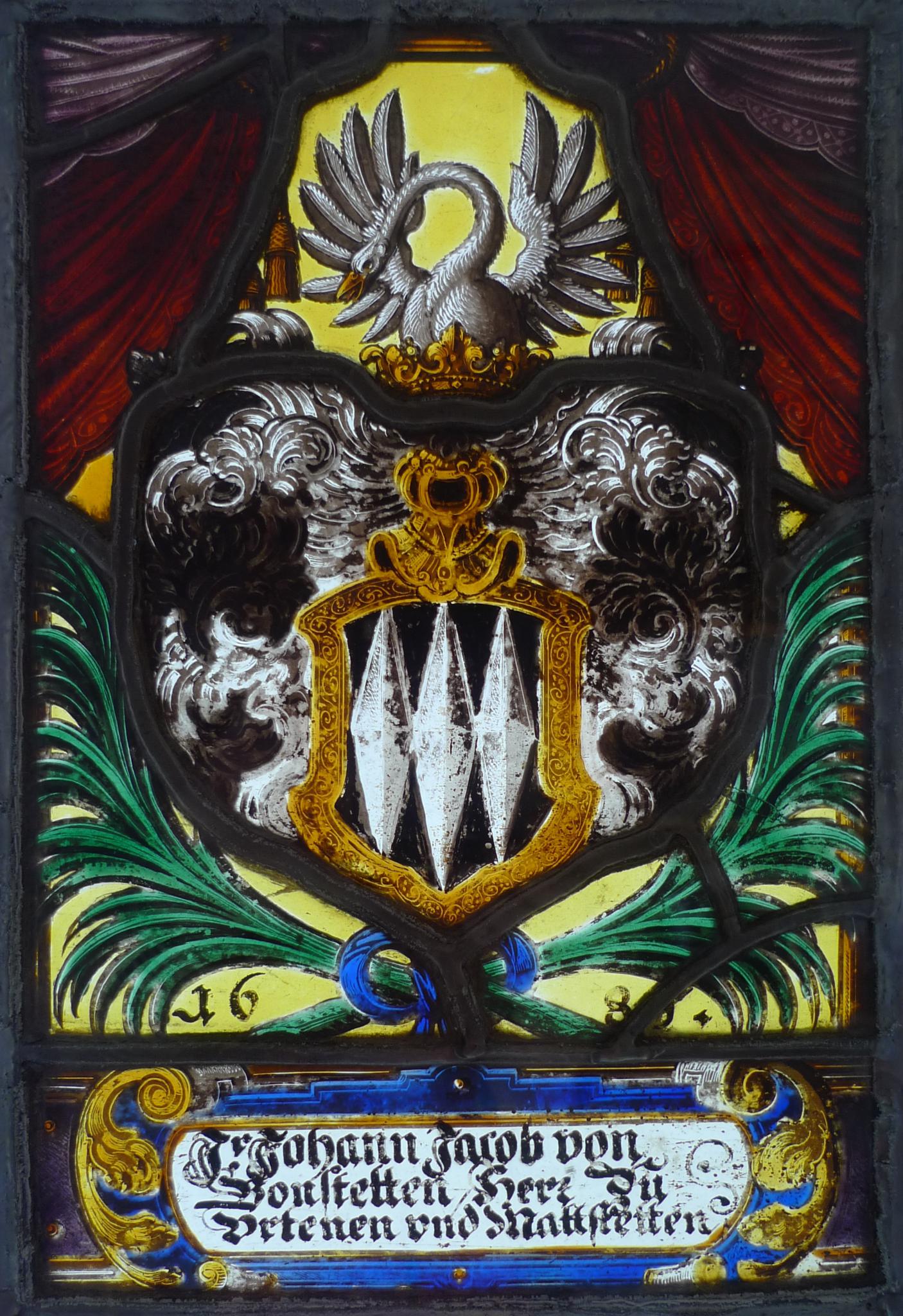 Von Johann Jakob von Bonstetten gibt es in Berner Privatbesitz zwei Scheiben aus den Jahren 1679 und 1680 (BE_8857, BE_8858). Zudem existiert von ihm in der Sammlung Wyss des Bernischen Historischen Museums ein Riss zu einer Allianzwappenscheibe, den er mit seiner zweiten Gemahlin zwischen 1672 und 1682 bei Hans Jakob Güder in Auftrag gab (BHM Bern, Inv. 20036.644; Hasler 1996/97, Bd. 2, Kat.-Nr. 463).