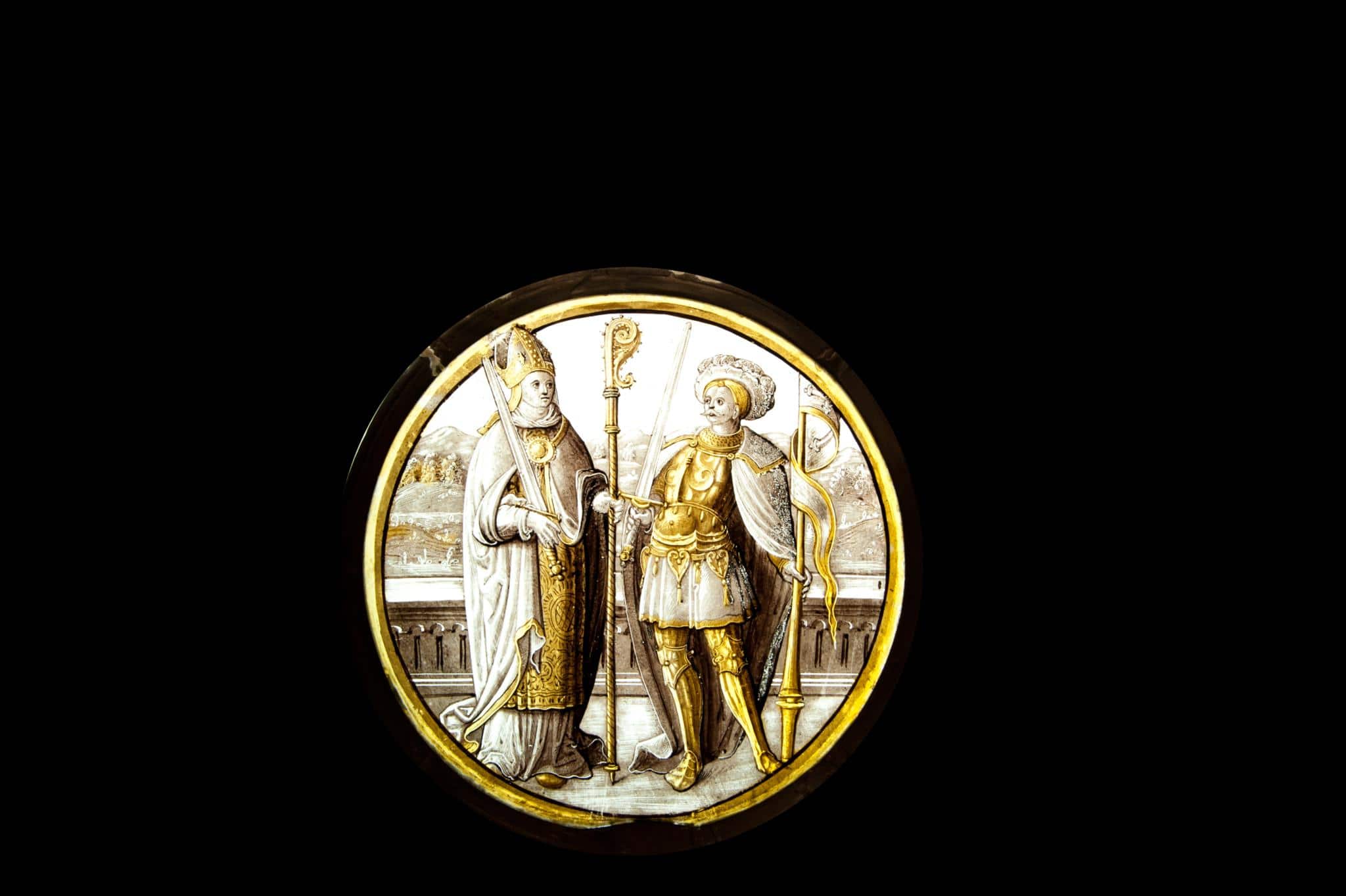 Vor einer Balustrade und einer Landschaft sind zwei nebeneinander stehende Figuren festgehalten, links ein Bischof in pontifikaler Messkleidung sowie mit Schwert und Krummstab in den Händen sowie rechts ein Kriegsmann, der über seiner goldenen Rüstung einen Mantel und Waffenrock und auf dem Kopf ein schmuckvolles Barett trägt. Während dieser wie der Bischof in seiner Rechten ein Schwert mit sich führt, hält er in seiner Linken einen Wimpel mit Kreuz. Obwohl die beiden Figuren keine Nimben besitzen, muss es sich bei Ihnen um zwei Heilige handeln. Im Inventar der Bundeskunstsammlung wird die Bischofsgestalt denn auch als hl. Stanislaus geführt. Diese Gleichsetzung trifft jedoch kaum zu, dürfte doch die wahrscheinlich aus Köln stammende Scheibe zwei dort verehrte Heilige wiedergeben, nämlich einerseits Bischof Evergislus und andererseits Gereon (s. u.).