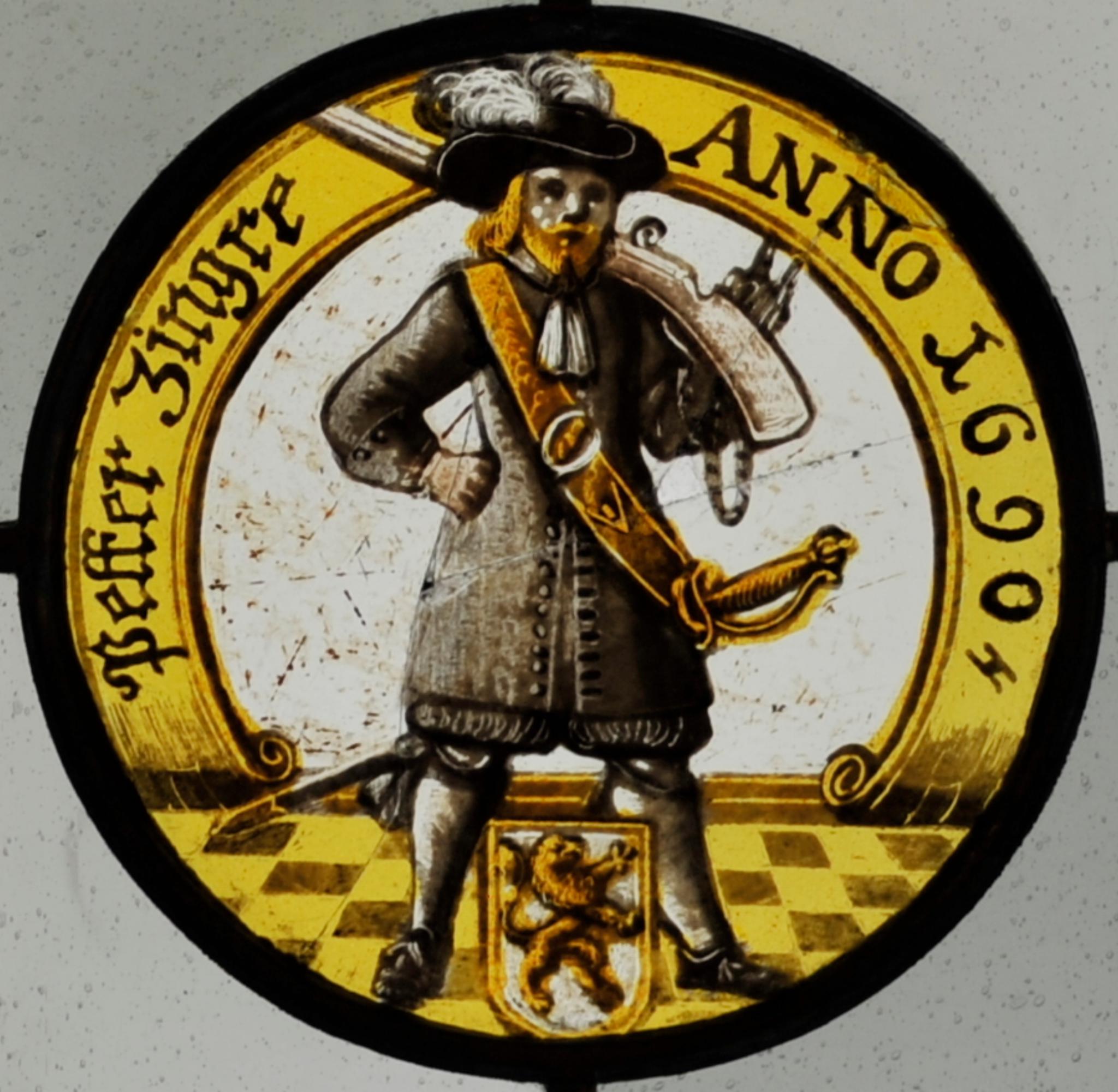 Die runde Monolithscheibe zeigt den auf Fliesenboden stehenden Stifter mit geschulterter Büchse und Schwert sowie mit seinem Wappen zwischen den Füssen. Die vor weissen Grund gesetzte Figur umfasst ein gelbes Schriftband mit dem Stifternamen.