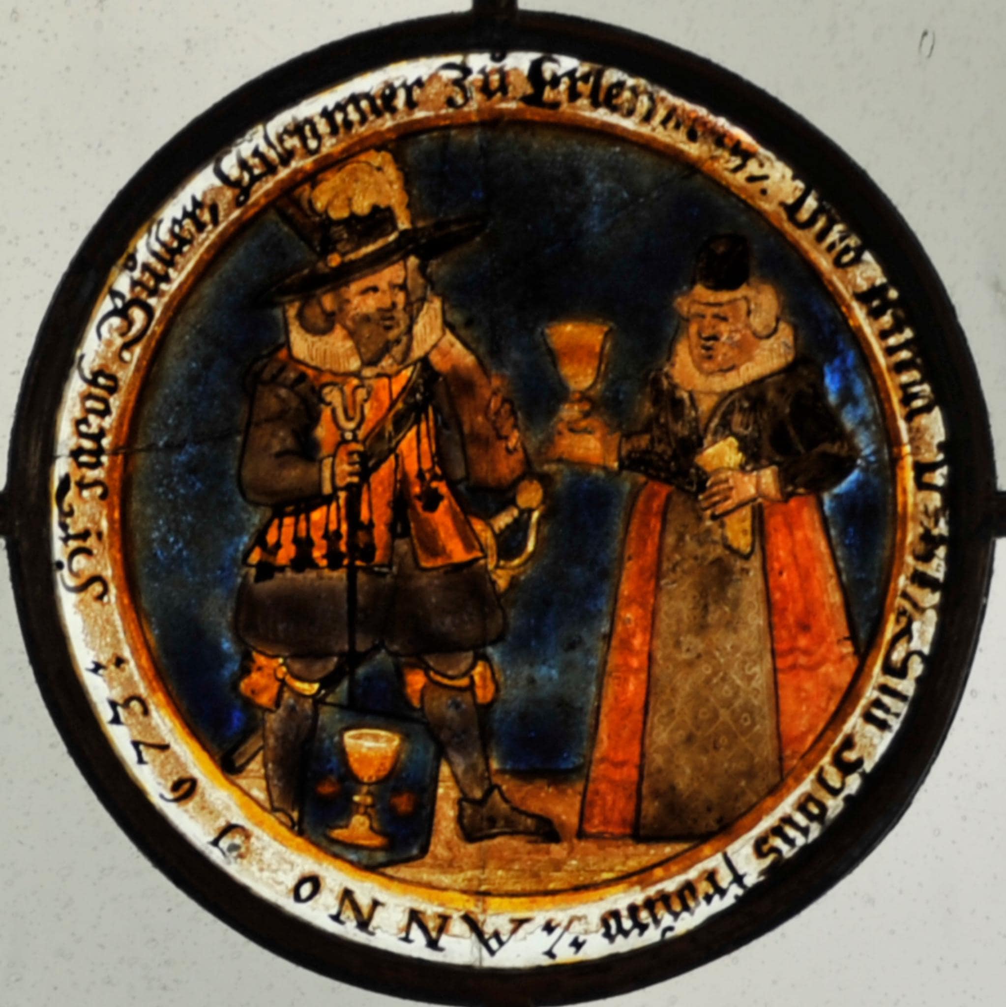 Die Rundscheibe zeigt den Stifter in Gestalt eines mit Schwert und Patronenbandelier ausgerüsteten Büchsenschützen, der sein Gewehr auf der Schulter trägt und in seiner Rechten die Gabel dazu hält. Mit dem Wappenschild zu seinen Füssen wendet er sich seiner Gemahlin zu. In der Linken ihre Handschuhe haltend, bietet ihm diese den mit Wein gefüllten Becher zum Willkomm an. Das vor blauem Grund stehende Ehepaar wird von der Stifterinschrift umrahmt.
