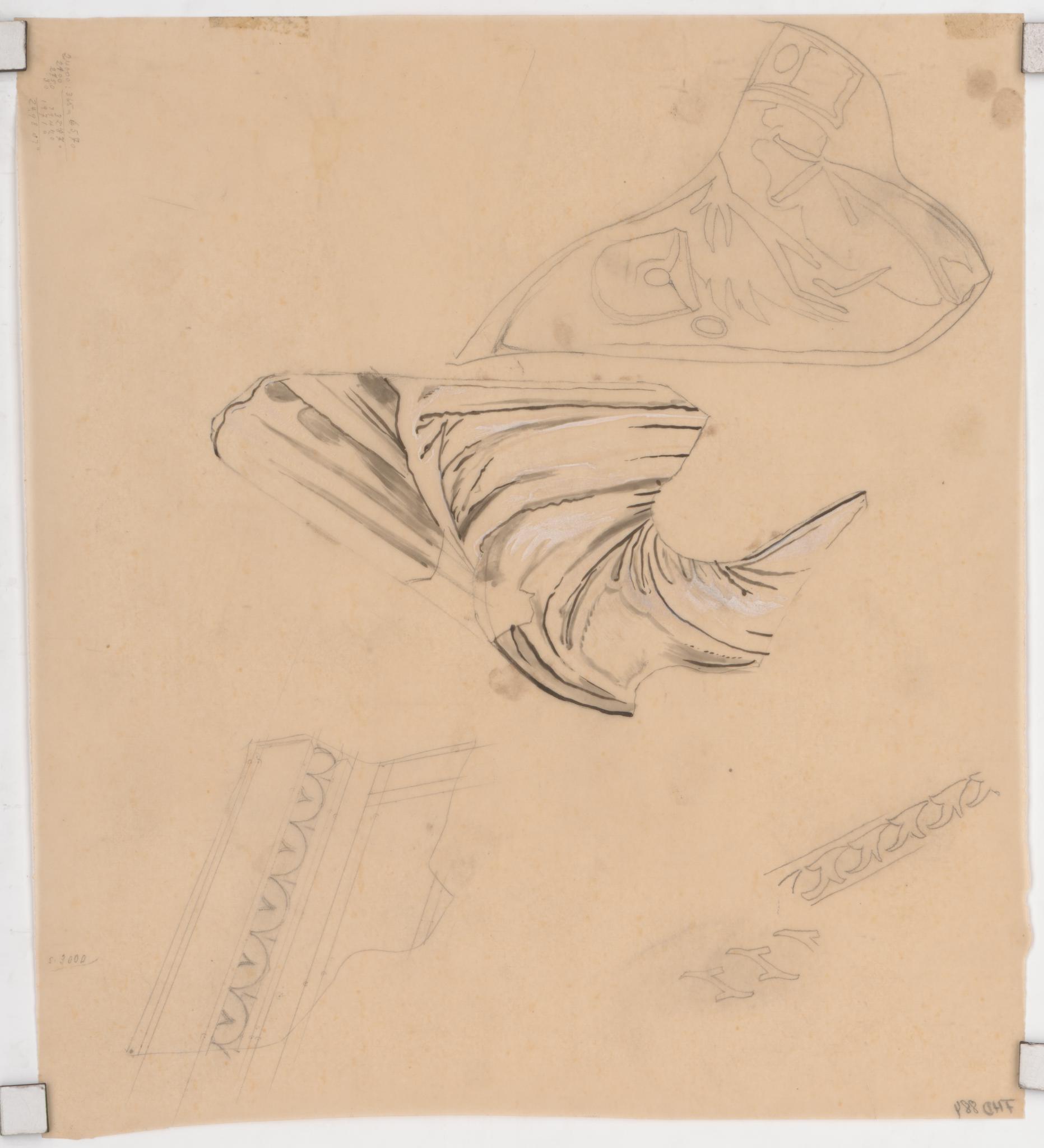 Der Restaurator setzte aufgrund dieser Schäden auch Ergänzungen ein (vgl. hierzu das Schema zu BE_1475). Die vorliegende Pause zeigt ein Stück des Sarges, das Drenckhahn ergänzte.