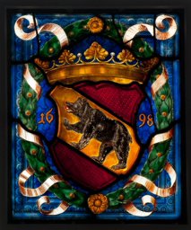 In einem von zwei Bändern umschlungenen Lorbeerkranz prangt das bekrönte Berner Wappen. Es erscheint vor Damastgrund, den ein mehrfach profilierter Rahmen mit Blütenmuster umfasst.