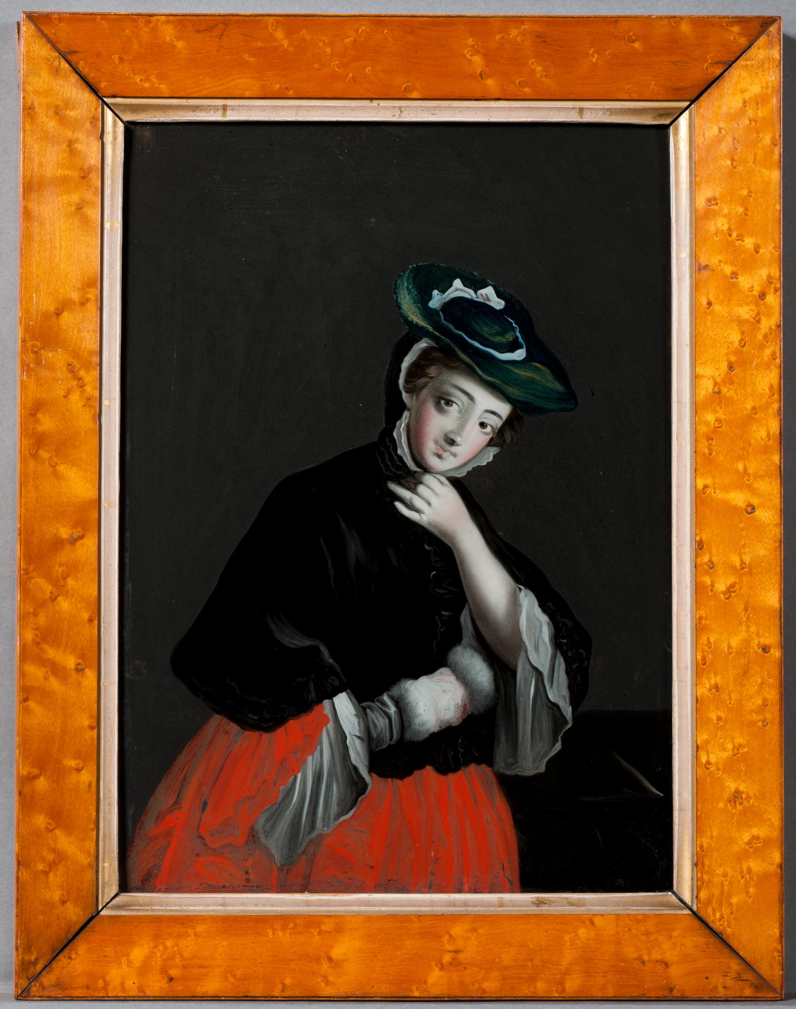 Junge Frau in rotem Kleid und schwarzer Samtpelerine mit Kapuze nach rechts gedreht. Sie trägt einen grünen, flachen Hut mit weissem Band. Die rechte Hand steckt in einem weissen Pelzmuff. Die andere hält den Kragen am Hals zu.