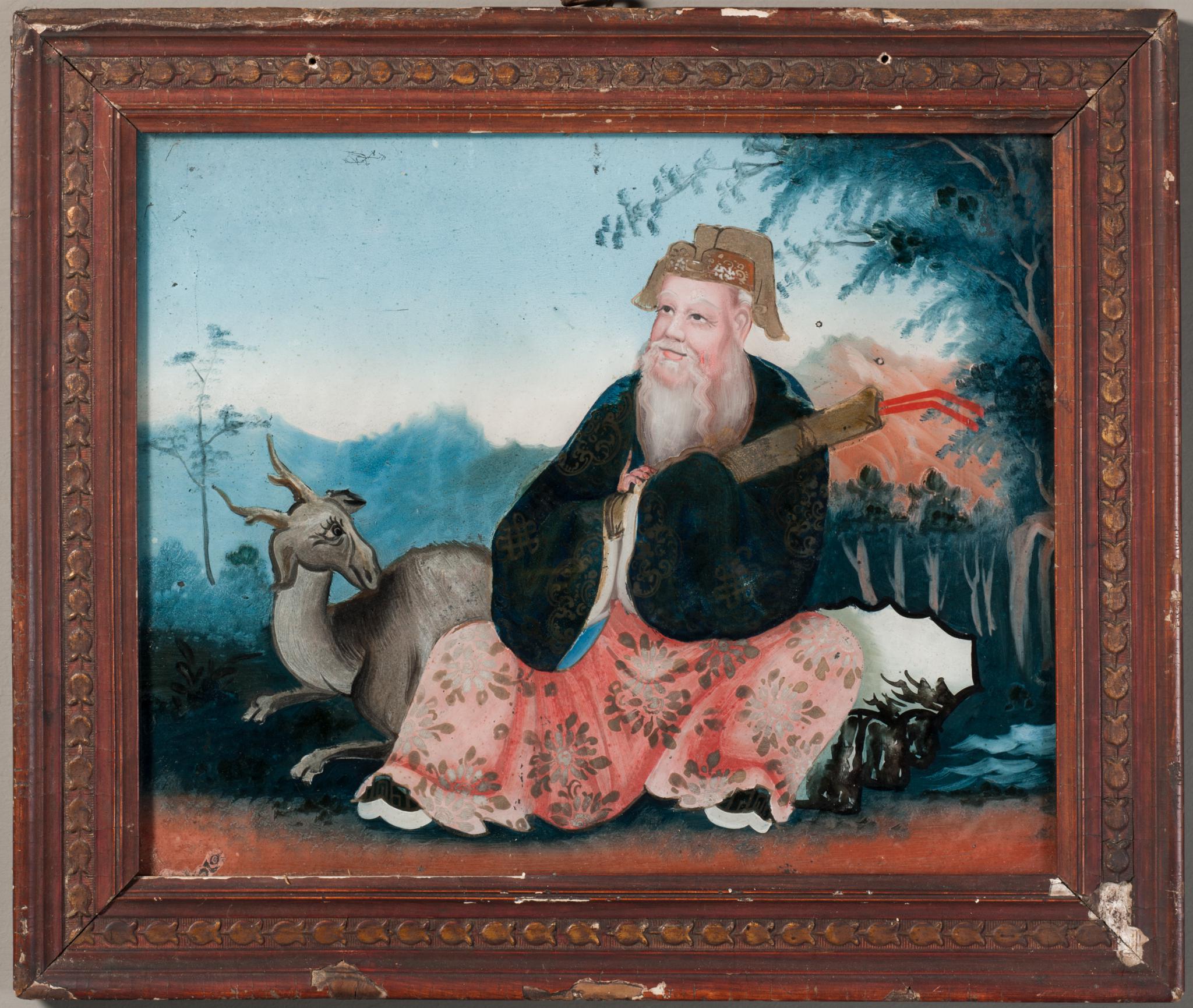 In hellrotem Kleid mit brokatmusterähnlichen Motiven und dunkelblauem Mantel sitzt ein alter, weissbärtiger Mann frontal auf einem Felsblock unter einem Baumast mit blau-grünen Blättern. Er hebt den Blick aus dem Dreiviertelprofil des hutbedeckten Kopfes leicht nach links oben. In den Händen hält er ein Musikinstrument, den Yü ku, aus dem die zwei roten geknickten Stäbchen herausragen, mit denen man diese Rohrtrommel schlägt. Neben ihm liegt links auf einer braunen Bodenerhebung ein Hirsch, der seinen Kopf zu ihm zurückwendet. Beim Gestein schlagen rechts kleine Wellen ans Ufer, an das ein Wald grenzt. Im Hintergrund erheben sich rechts im Abendrot hohe Berge.