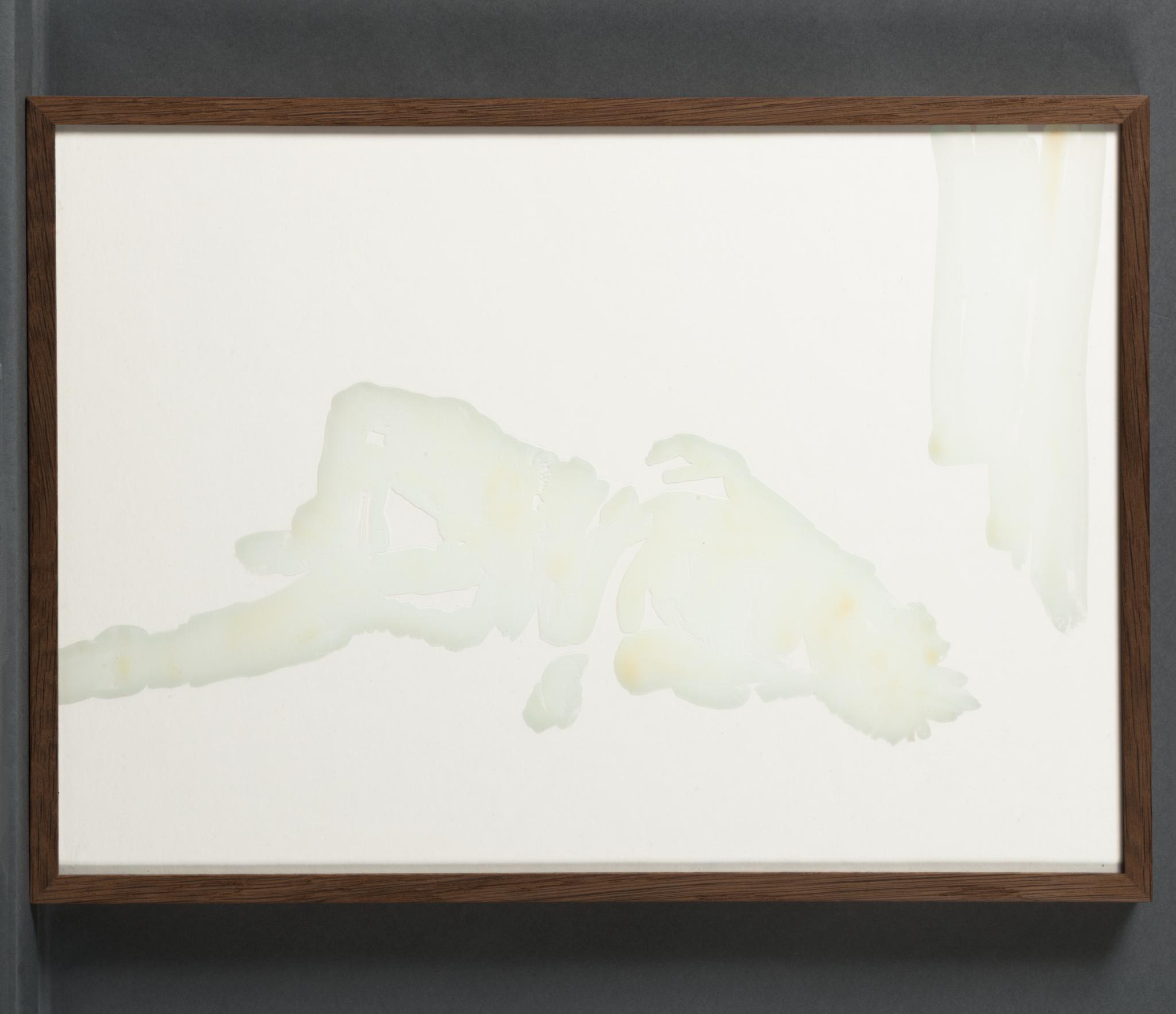 Auf dem Boden liegender Mann in Fluchtpunktansicht. Rechts von ihm ein Vorhang. Das Bild ist wegen des speziell verwendeten Malmittels in weissen Tönen gehalten.