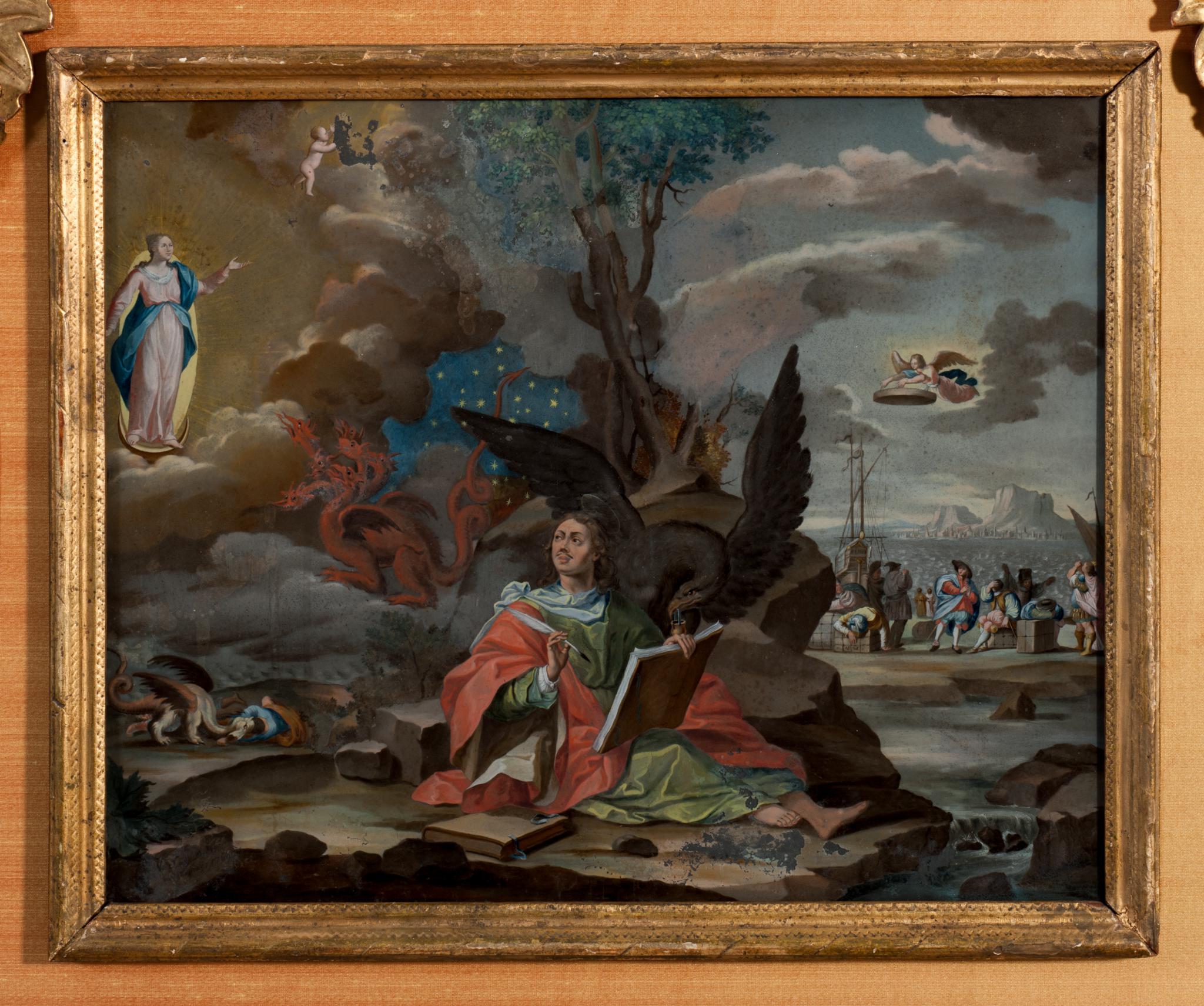 Frieder Ryser sah in Johann Crescenz Meyer "vorbehaltlos den besten Hinterglasmaler der Surseer-Schule" (Ryser 1991, S. 177) und schrieb ihm anhand der Signatur mit dem Vermerk "invent." die Komposition selbst zu. Es ist jedoch unwahrscheinlich, dass der Maler Johann Crescenz Meyer allein in der Lage war, eine derart komplexe Bildaussage und -gestaltung zu entwerfen, die verschiedene Szenen der Johannesoffenbarung wiedergibt (Apk). Vielmehr übernimmt er für den linken Mittelgrund mit der menschenfressenden Bestie teilweise und für den rechten Mittelgrund mit dem mühlsteinwerfenden Engel, der Insel und der Hafenszene ganz und detailgetreu seitenverkehrt zwei Kupferstiche aus Melchior Küsells Bibel von 1680 (www.johannesoffenbarung.ch/bilderzyklen/kuesell.php. Am 26.11.2015). Für den Oberkörper der jugendlich dargestellten Hauptfigur, die durch den flaumigen Schnauz und langwallendes Lockenhaar gekennzeichnet ist, und für den Adler mit dem Tintenfass lag Johann Crescenz Meyer offenbar als Vorlage ein Stich Cornelis Visschers (1628/29–1658) vor, der 1650 in Haarlem gestochen worden war. Die "Inventio" Johann Crescenz Meyers würde sich somit auf die Zusammenstellung der verschiedenen Vorlagenteile beschränken. Im Gesamtwerk Meyers nimmt das Hinterglasgemälde mit dessen Namenspatron eine gewichtige Stellung ein, ohne dass klar wird, ob und inwieweit auch Einflussnahmen von Theologen zu Bildinhalt und -komposition beitrugen.