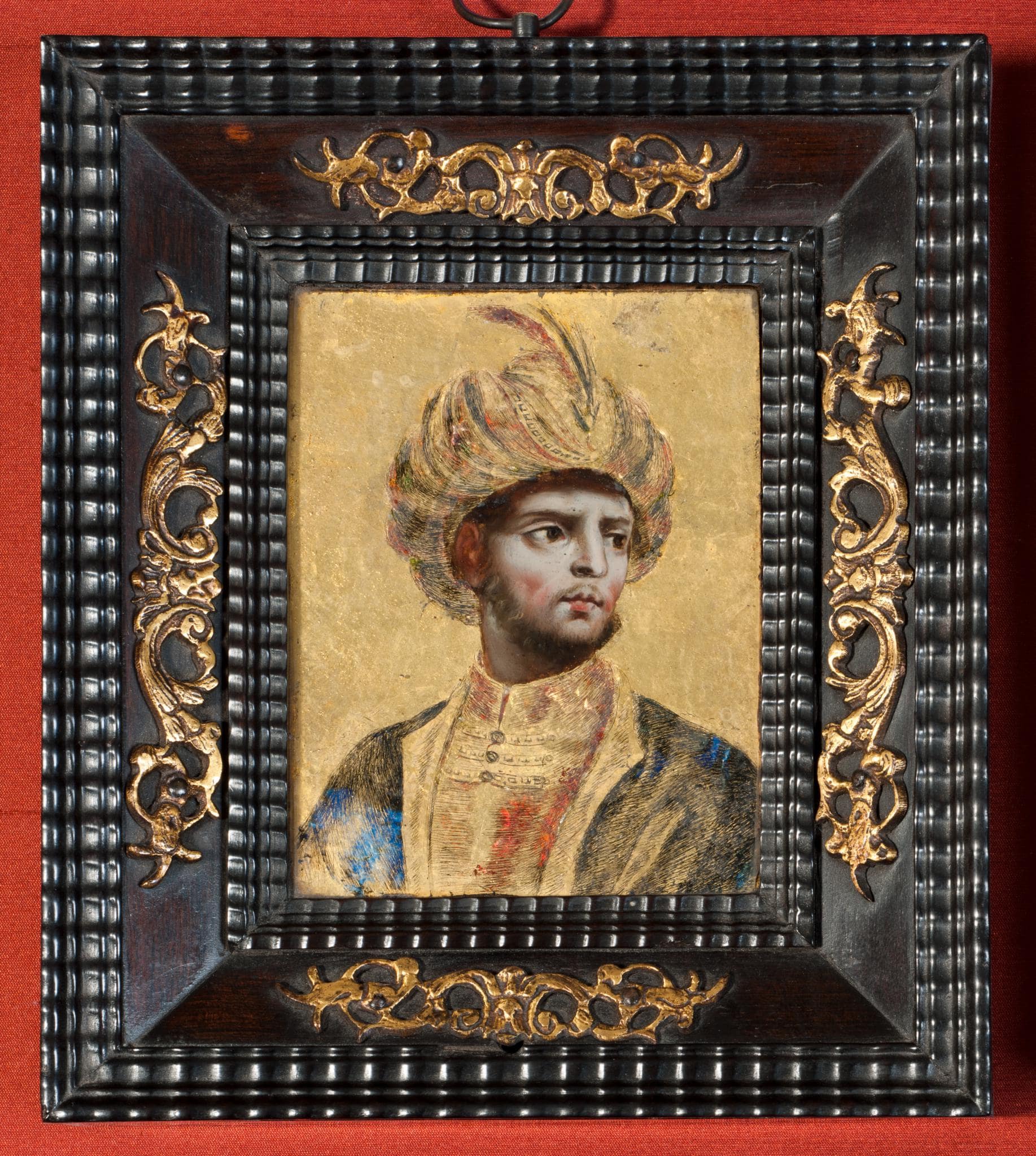 Auf goldenem Grund erscheint die Büste eines jungen, bärtigen Mannes, der im Dreiviertelprofil nach rechs blickt. Er trägt auf dem Kopf einen federbesteckten rot-goldenen Turban.