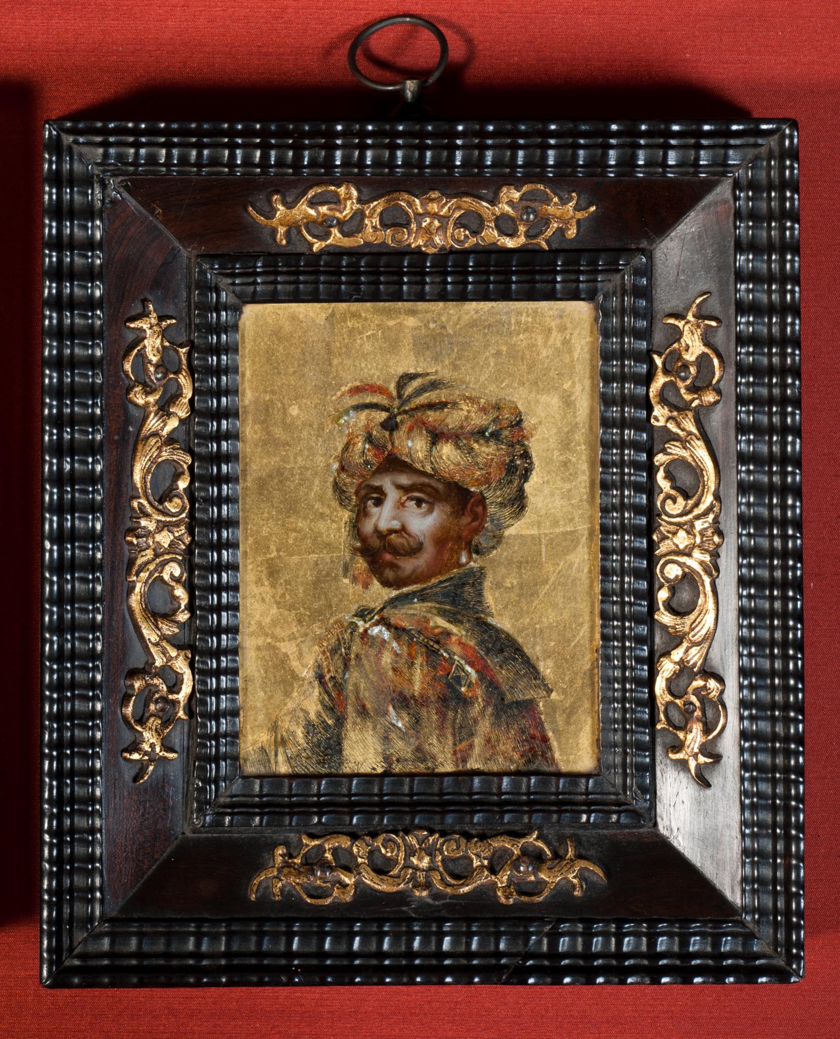 Auf goldenem Grund erscheint die Büste eines Mannes mit Schnurrbart, der im Dreiviertelprofil nach links den Betrachter über seine Schulter anblickt. Er trägt eine Ohrperle und auf dem Kopf einen federbesteckten rot-goldenen Turban.