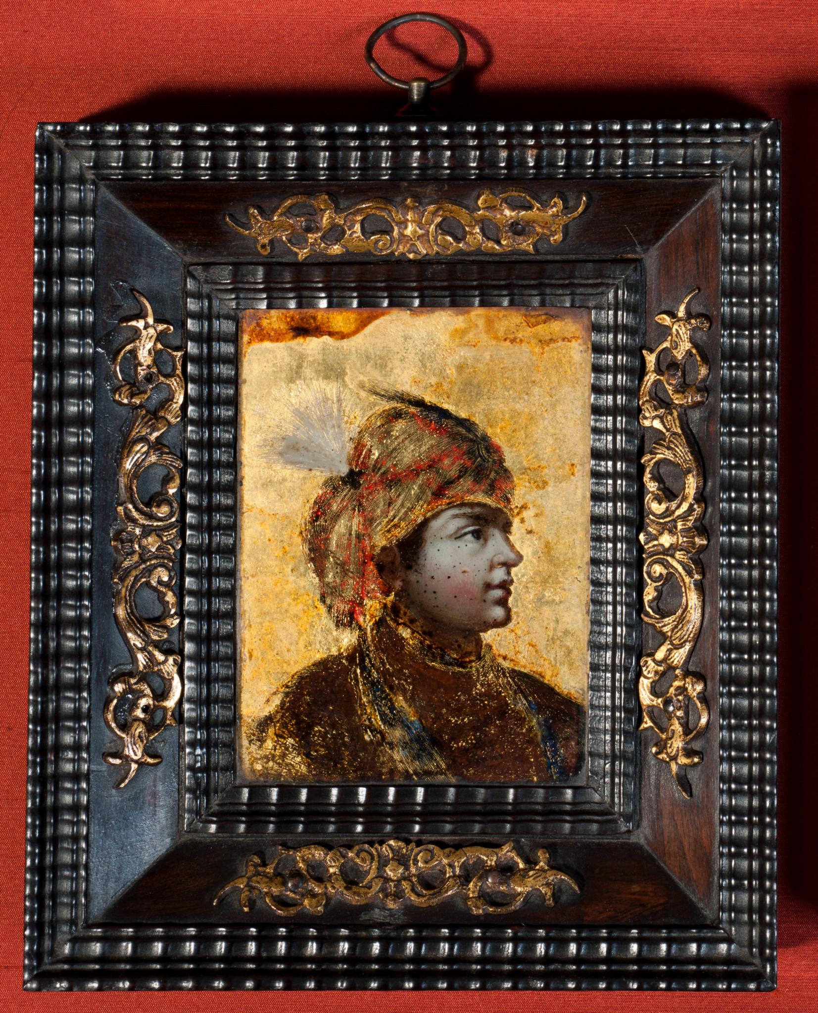 Dieses Hinterglasbild gehört zu einer Serie von sechs Hinterglasbildern, die nach Radierungen von Stefano della Bella (1649–1651) ameliert worden sind. Es handelt sich um eine Folge von zwölf Graphiken unter dem Titel "Mehrere Köpfe nach Art der Perser frisiert". Vielleicht noch teilweise in Paris entstanden, teilweise aber sicher in Florenz, dürften diese weiterhin in Frankreich ediert worden sein. Sie liefern einen Terminus post quem für die Entstehung der Hinterglasbilder, die möglicherweise als Schubladen- oder Türfronten ursprünglich Teile eines Kabinettschrankes waren. Die Vorliebe für Exotisches ist durch Allegorien und idyllische Darstellungen der vier Kontinente in Hinterglasmalereien zeitgenössischer Kabinettschränke gut belegt (Vitrocentre Romont, Slg. R.+F. Ryser RY 3051; Neapel, um 1650).