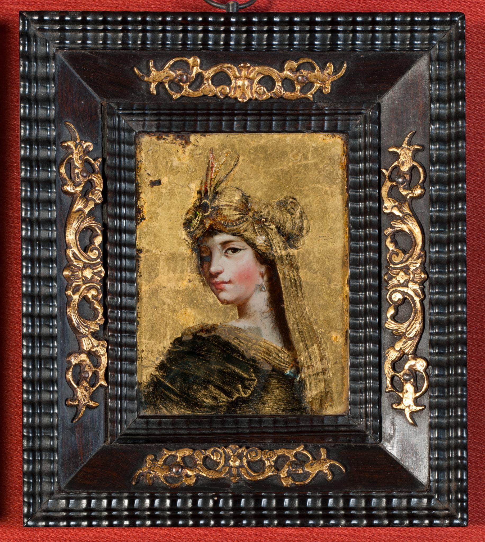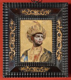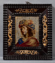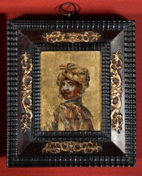 Dieses Hinterglasbild gehört zu einer Serie von sechs Hinterglasbildern, die nach Radierungen von Stefano della Bella (1649–1651) ameliert worden sind. Es handelt sich um eine Folge von zwölf Graphiken unter dem Titel "Mehrere Köpfe nach Art der Perser frisiert". Vielleicht noch teilweise in Paris entstanden, teilweise aber sicher in Florenz, dürften diese weiterhin in Frankreich ediert worden sein. Sie liefern einen Terminus post quem für die Entstehung der Hinterglasbilder, die möglicherweise als Schubladen- oder Türfronten ursprünglich Teile eines Kabinettschrankes waren. Die Vorliebe für Exotisches ist durch Allegorien und idyllische Darstellungen der vier Kontinente in Hinterglasmalereien zeitgenössischer Kabinettschränke gut belegt (Vitrocentre Romont, Slg. R.+F. Ryser RY 3051; Neapel, um 1650).