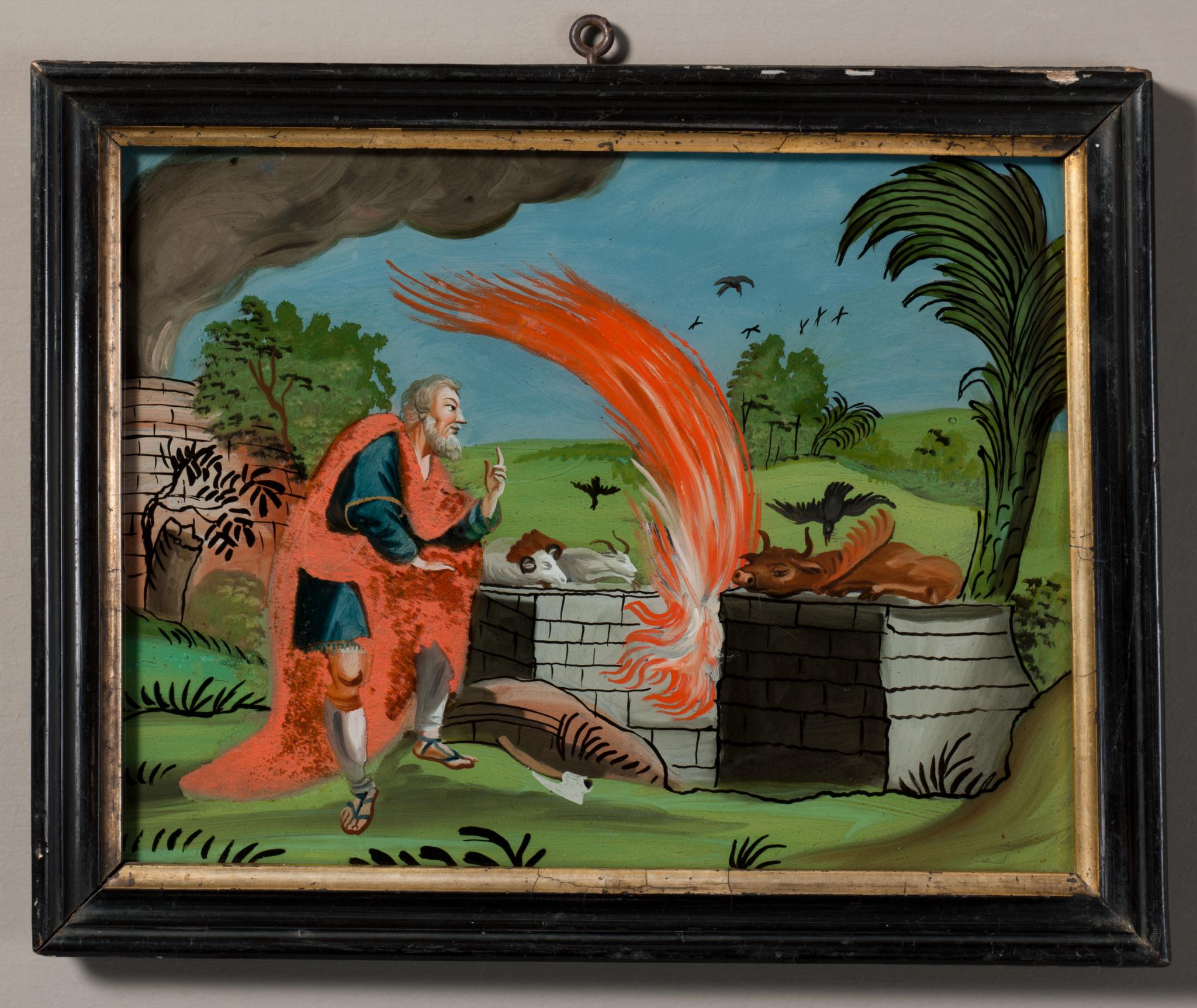 Das Hinterglasgemälde bildet mit jenem, welches die Opferung Isaaks durch Abraham zeigt (Vitrocentre Romont, Inv.-Nr. RY 682), ein Pendant-Paar. Die Zuweisung an die Tiroler Malschule erscheint durch zahlreich erhaltene Vergleichsbilder gesichert. Die Konturenmalerei, die Art der sich dunkel abhebenden Grasblätter, die Farbpalette mit dem Dreiklang Hellblau, Rot und charakteristischem Grün lassen kaum Zweifel an der Herkunft dieser beiden Hinterglasmalereien zu (zu den besonderen Merkmalen der Tiroler Hinterglasbilder s. Steiner 2009, S. 46–49). Frieder Ryser hat 1994 anhand einer Unterlage-Makulatur, stilistischer und maltechnischer Überlegungen sowie lokalgeschichtlicher Hinweise von Ferdinand Fuchs eine präzisere Einordnung dieser Art Bilder nach Lechaschau (nahe Reutte) ins Ausserfern versucht und anhand der mit Stahlfeder beschriebenen Unterlage eine späte Datierung um 1850 vorgeschlagen, doch verrät die Malerei stilistisch keine archaisierende Unsicherheiten.