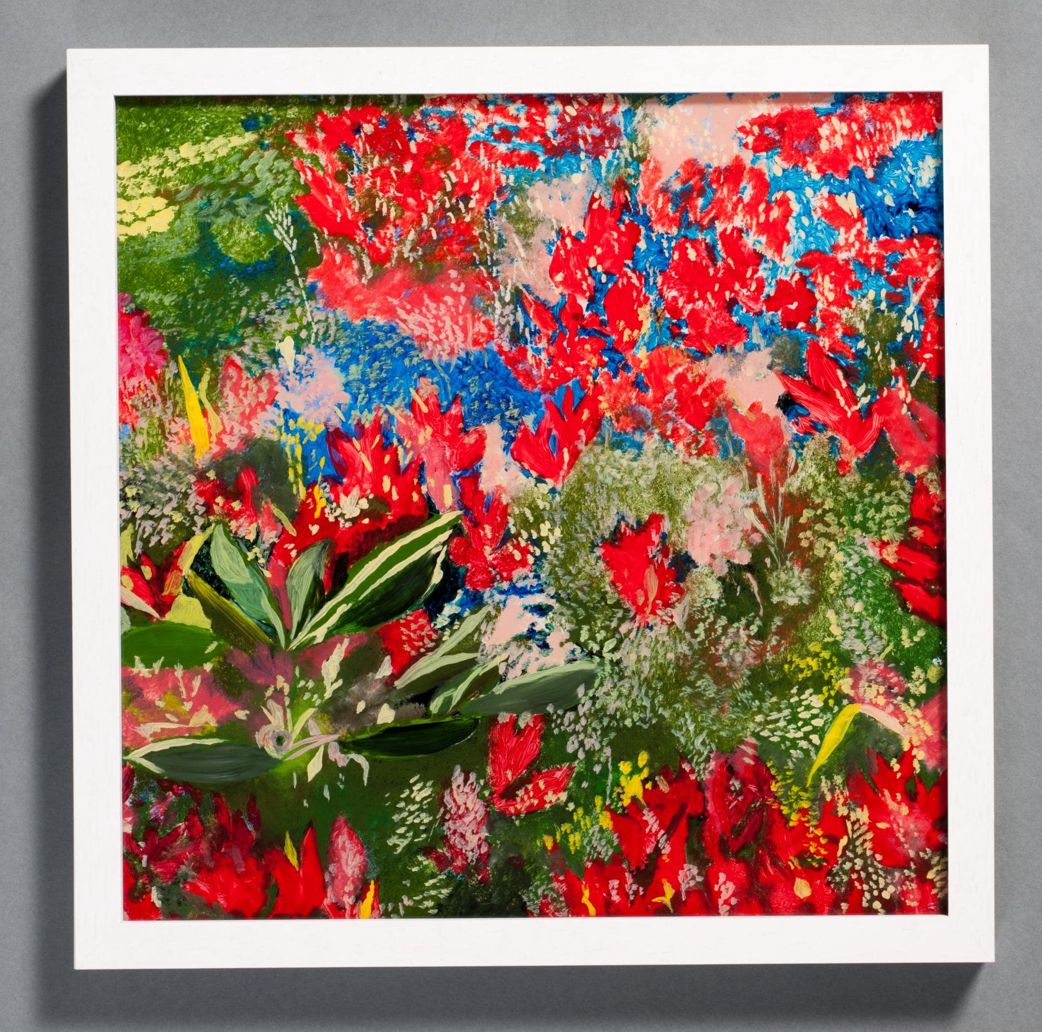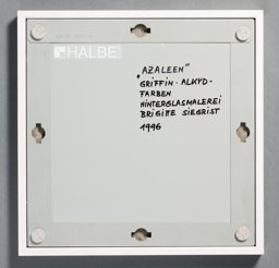 Der Rückseitenschutz ist mit Bleistift und mit schwarzem Filzstift beschriftet: "AZALEEN" / GRIFFIN-ALKYD- / FARBEN / HINTERGLASMALEREI / BRIGITTE SIEGRIST / 1996.