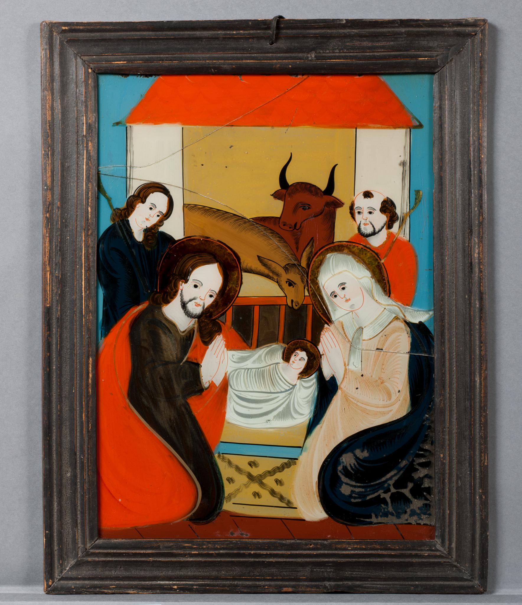 Geburt Christi im Stall zu Bethlehem. Im Vordergrund knien links der hl. Josef und rechts die hl. Maria mit gefalteten Händen vor dem Christuskind, das in Wickeln in der Krippe liegt. Die drei Hauptfiguren besitzen einen goldfarbenen Nimbus. Hinter ihnen stehen ein junger und ein alter Hirte mit ihrem Stab. Im Hintergrund ist unter blauem Himmel eine Stallarchitektur mit weissen Mauern und rotem Dach angedeutet. Aus ihrem ockergelben Innern beugen sich Esel und Ochse über die Krippe.
