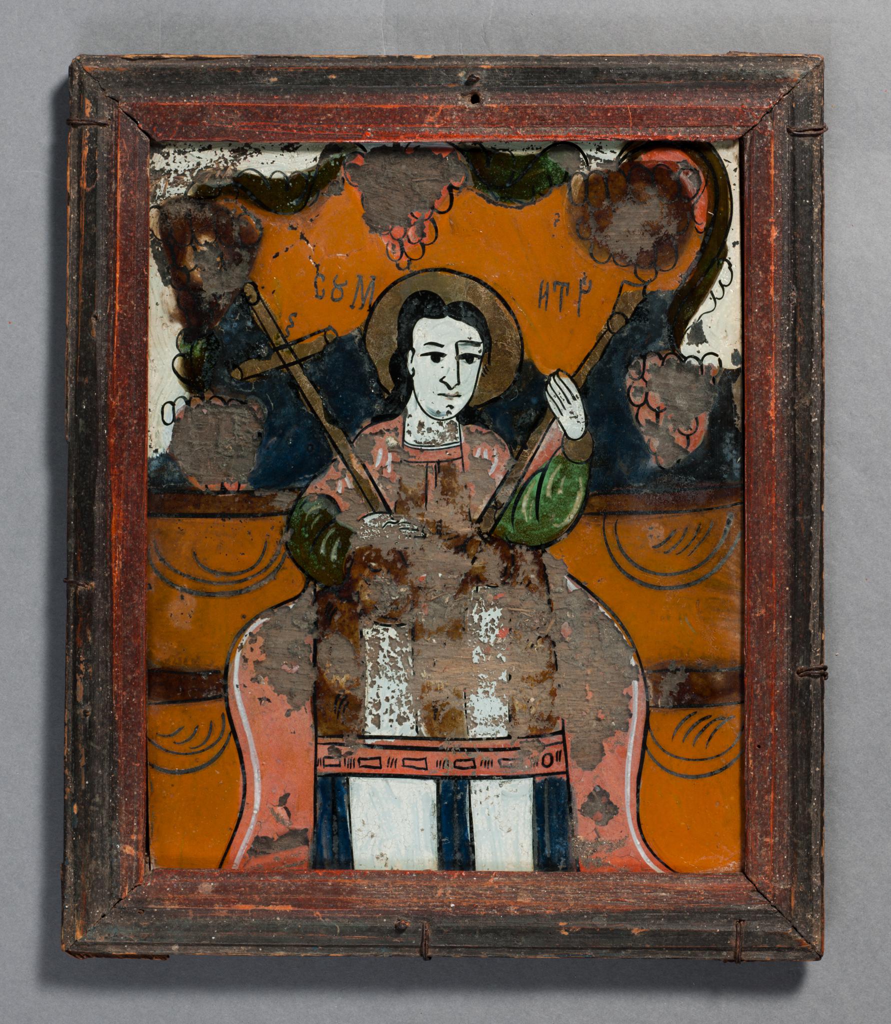 Der vor einer das Bild waagrecht teilenden Draperie frontal sitzend dargestellte Heilige trägt Kreuz und Zepter. Sein Oberkörper und seine Insignien heben sich von der rot-blauen Weinlaube ab, die ihn vor dem hellen Hintergrund umfängt. Die Inschrift zu Seiten des goldenen Nimbus weisen ihn als den hl. Demetrios aus.