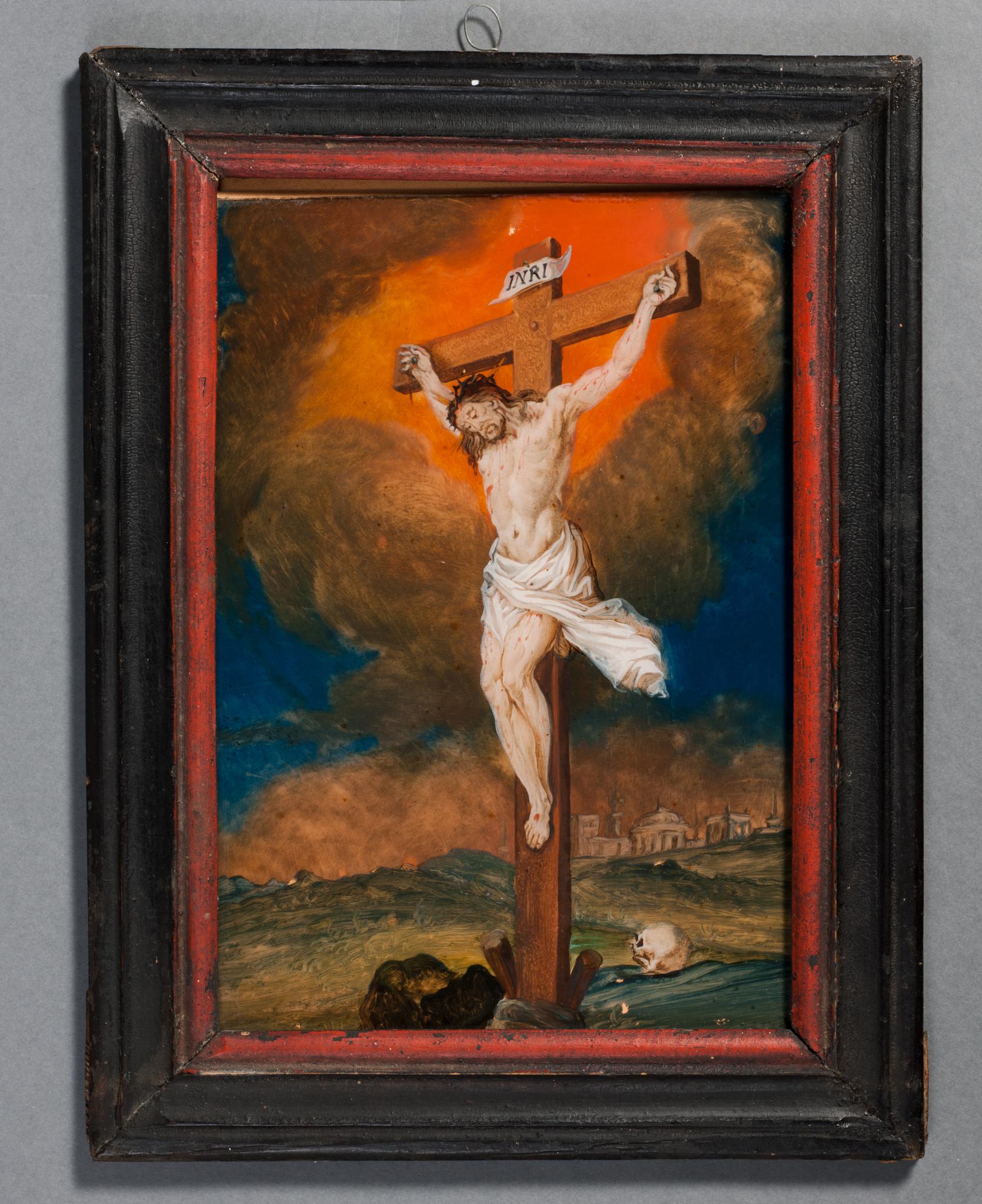 Das Kreuz mit dem Corpus Christi auf dem Kalvarienberg ist schräg in das Bild hineinkomponiert. Jesus neigt seinen Kopf mit der Dornenkrone zur linken Schulter. Das weisse Lendentuch flattert in der Luft. Am Kreuzfuss liegt der Adamsschädel, im Hintergrund ist die Stadt Jerusalem zu sehen. In der Stunde seines Todes reisst sich die dunkelblaue, mit Wolken bedeckte Finsternis orange flammend auf.
