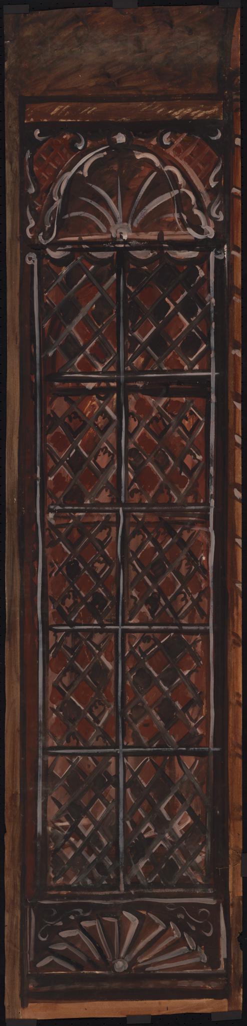 Carton en couleur pour une verrière ornementale dans les tons gris-bruns : fenêtre rectangulaire à fond de verre simple en losange, avec au sommet un ornement en forme de conque, et dans la partie basse, un socle avec un ornement en forme de demi-roue.