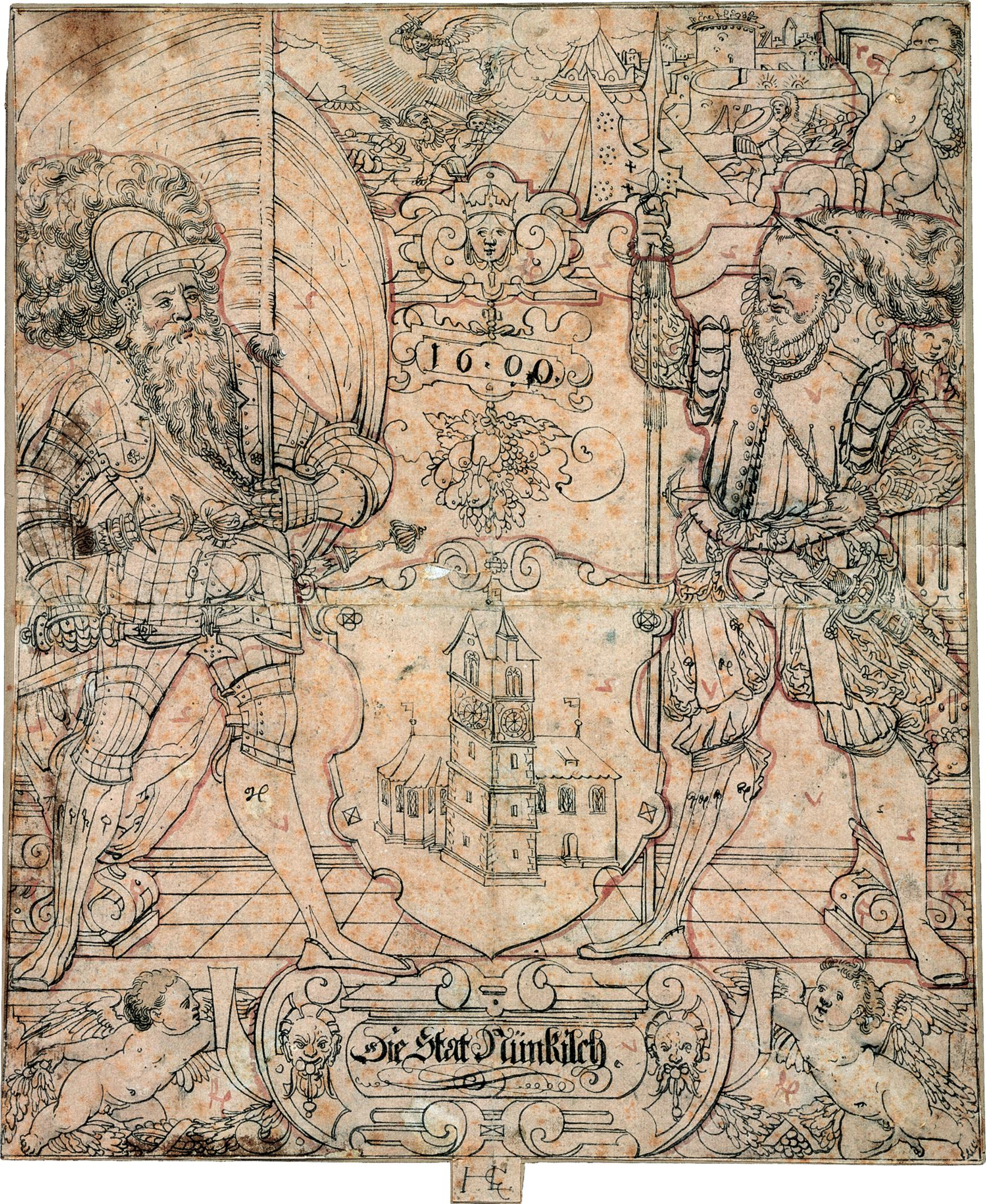 Das Wappen der Stadt Neunkirch wird von zwei auf Fliesenboden stehenden Schildhaltern begleitet. Links präsentiert der Stadtfähnrich in voller Rüstung, den Federbuschhelm auf dem bärtigen Haupt, das Stadtbanner, rechts wacht ein Halbartier mit geschlitztem Wams, Pluderhosen und Federhut. Vom Architrav der Rahmenarchitektur mit der kopfgeschmückten Zentralkartusche hängen ein Täfelchen mit der Jahrzahl und ein Fruchtbouquet über dem Wappenschild herab. Das Oberbild zeigt, wie der Engel Gottes während der Belagerung der Stadt Jerusalem die Fürsten und Hauptleute des assyrischen Königs Sancherib vernichtet (2 Chr 32). Am Fuss der Scheibe nimmt eine reiche Rollwerktafel zwischen mit Girlanden spielenden Putten die Stifterinschrift auf.