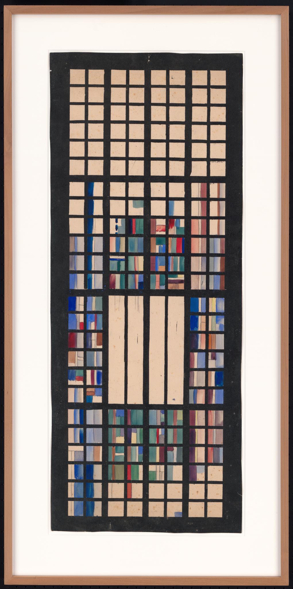 Etude de la coloration de l’important encadrement ornemental entourant la scène figurative d’un vitrail de l’Antoniuskirche de Bâle. La verrière rectangulaire est divisée en 24 x 8 carrés. 7/8 de la surface est occupée par une composition géométrique, des rectangles de différentes couleurs avec une prédominance bleue et verte. La partie supérieure et inférieure de cette étude n’a pas été complétée, de même que l’emplacement réservé à la scène figurative. Le projet est encadré et placé sous passe-partout.